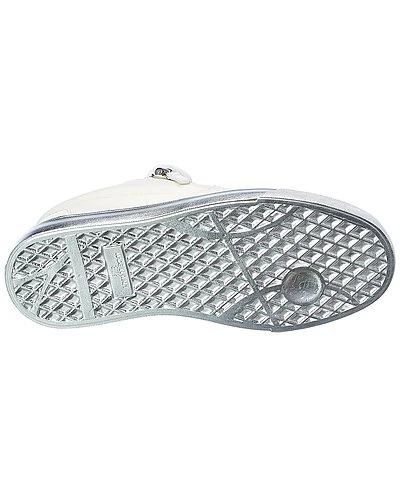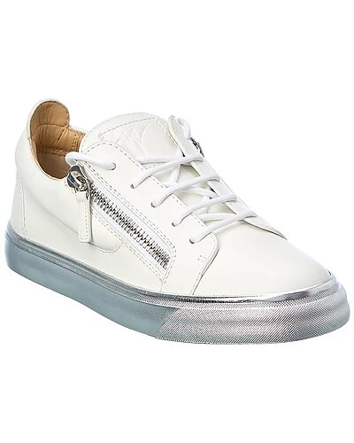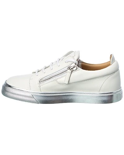 - Augus Leather Sneaker in white leather and silver-tone hardware with zipper accents and metallic sole