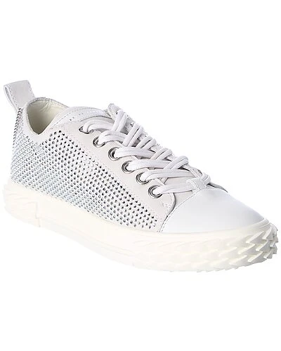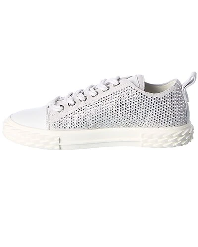 - Blabber Suede Sneaker in white suede and silver-tone hardware with rhinestone detailing, zipper trim, and textured sole