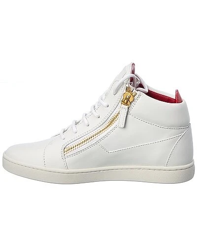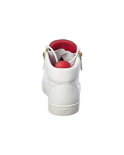 - Brek Leather High-Top Sneaker in white and red leather and gold-tone hardware with zipper accents