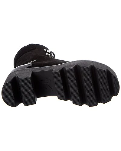 - Daikiri 20 Suede & Patent Platform Boot in black suede and patent leather and silver-tone hardware with fur detailing and inner side zipper