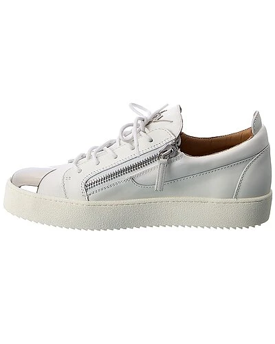 - May London Canvas & Leather Sneaker in white canvas and leather and silver-tone hardware with zipper accents and cap toe