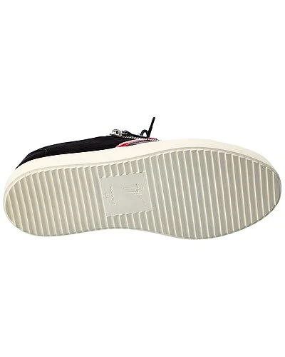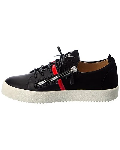 - May London Leather & Suede Sneaker in black and red leather and suede and silver-tone hardware with logo and zipper accents