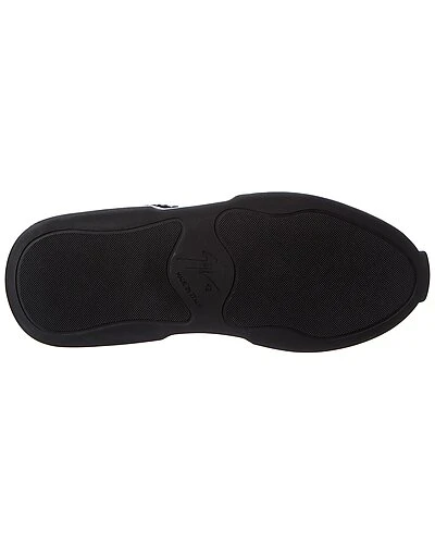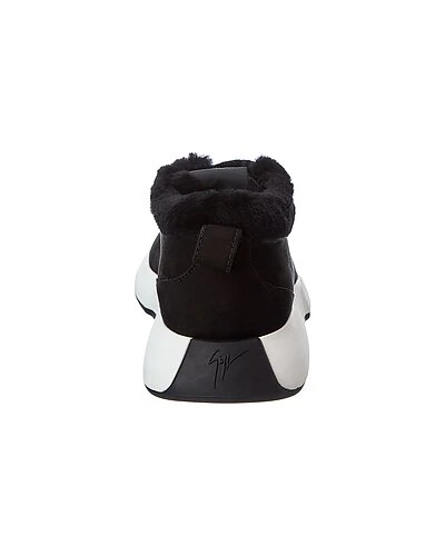 - Omnia Suede & Shearling Sneaker in black suede and shearling with chenille laces