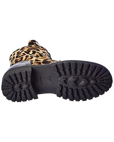 - Velvet & Patent Combat Boot in brown leopard velvet and black patent leather and gold-tone hardware with logo tongue and inner side zipper