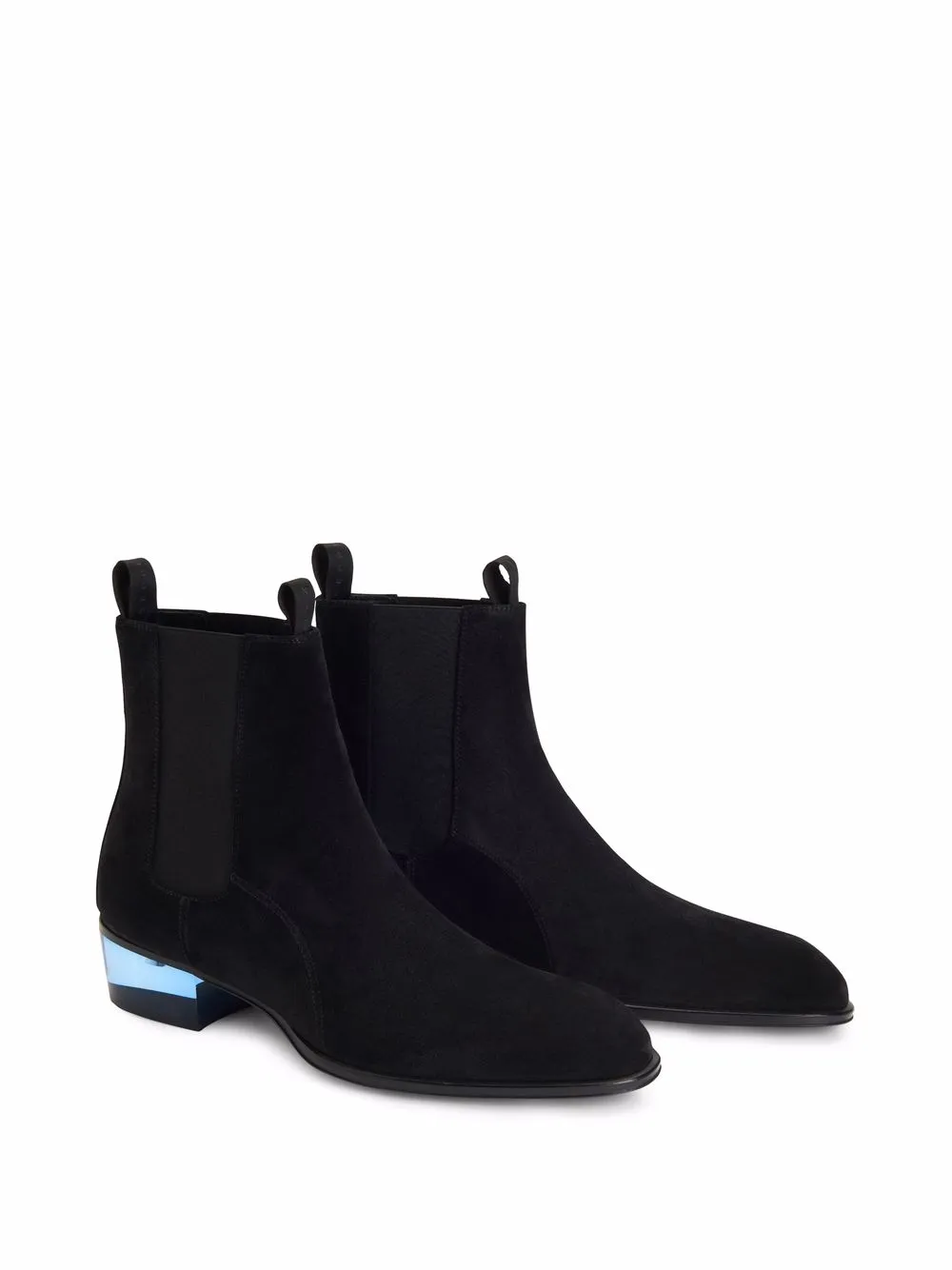 Black/blue leather/suede Abbey Plexy ankle boots from Giuseppe Zanotti featuring almond toe, elasticated side panels, ankle-length, low block heel and pull tab to the front and rear.