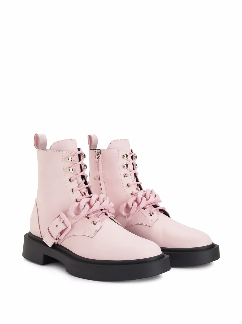Pink/black leather Adric chain-trim ankle boots from Giuseppe Zanotti featuring chain-link detailing, round toe, side buckle fastening, front lace-up fastening, side zip fastening, ankle-length, pull-tab at the heel and chunky rubber sole.