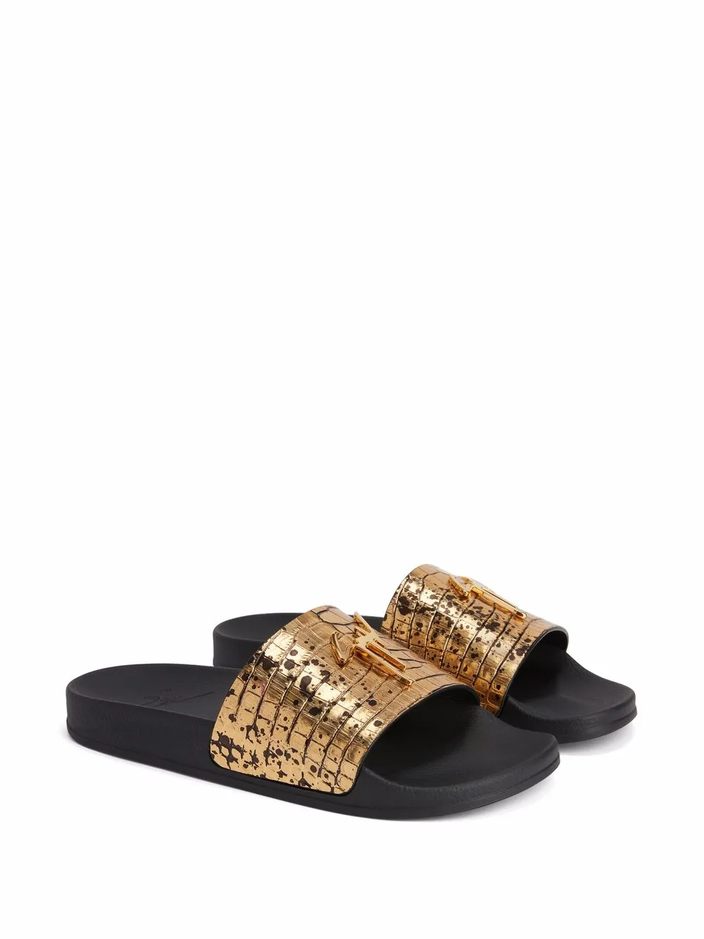 Black/gold leather Brett crocodile-embossed sliders from Giuseppe Zanotti featuring embossed crocodile effect, logo patch to the front, metallic effect, open toe and flat rubber sole.