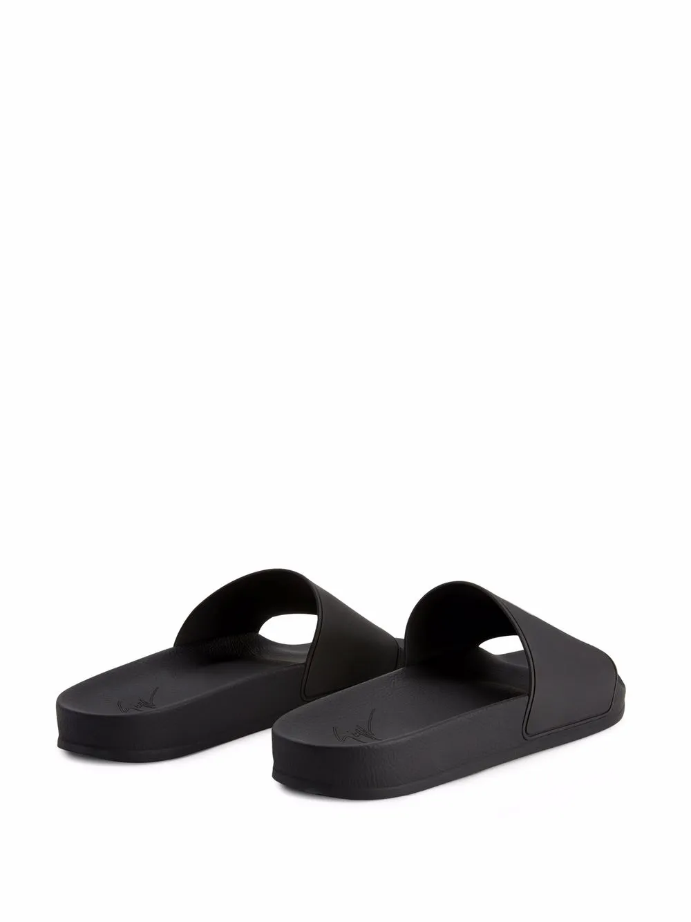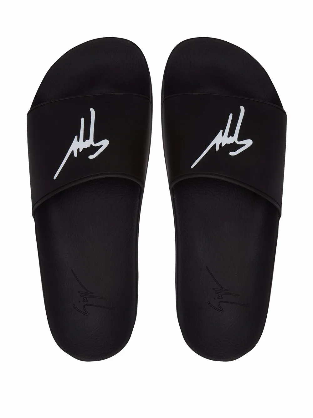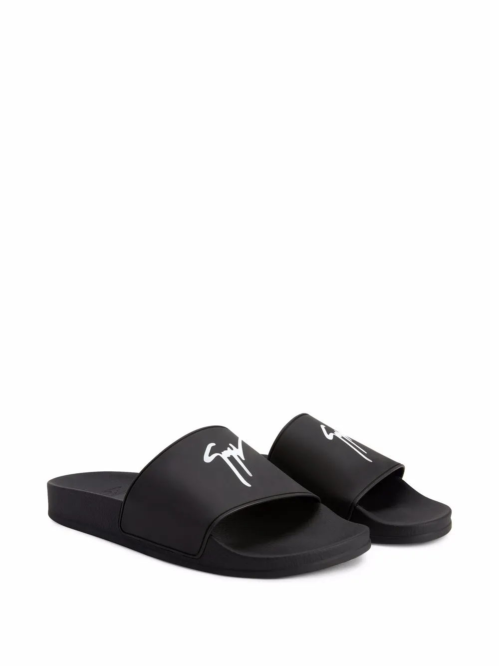 Black Brett logo print slides from Giuseppe Zanotti featuring logo print to the front, open toe and flat rubber sole.
