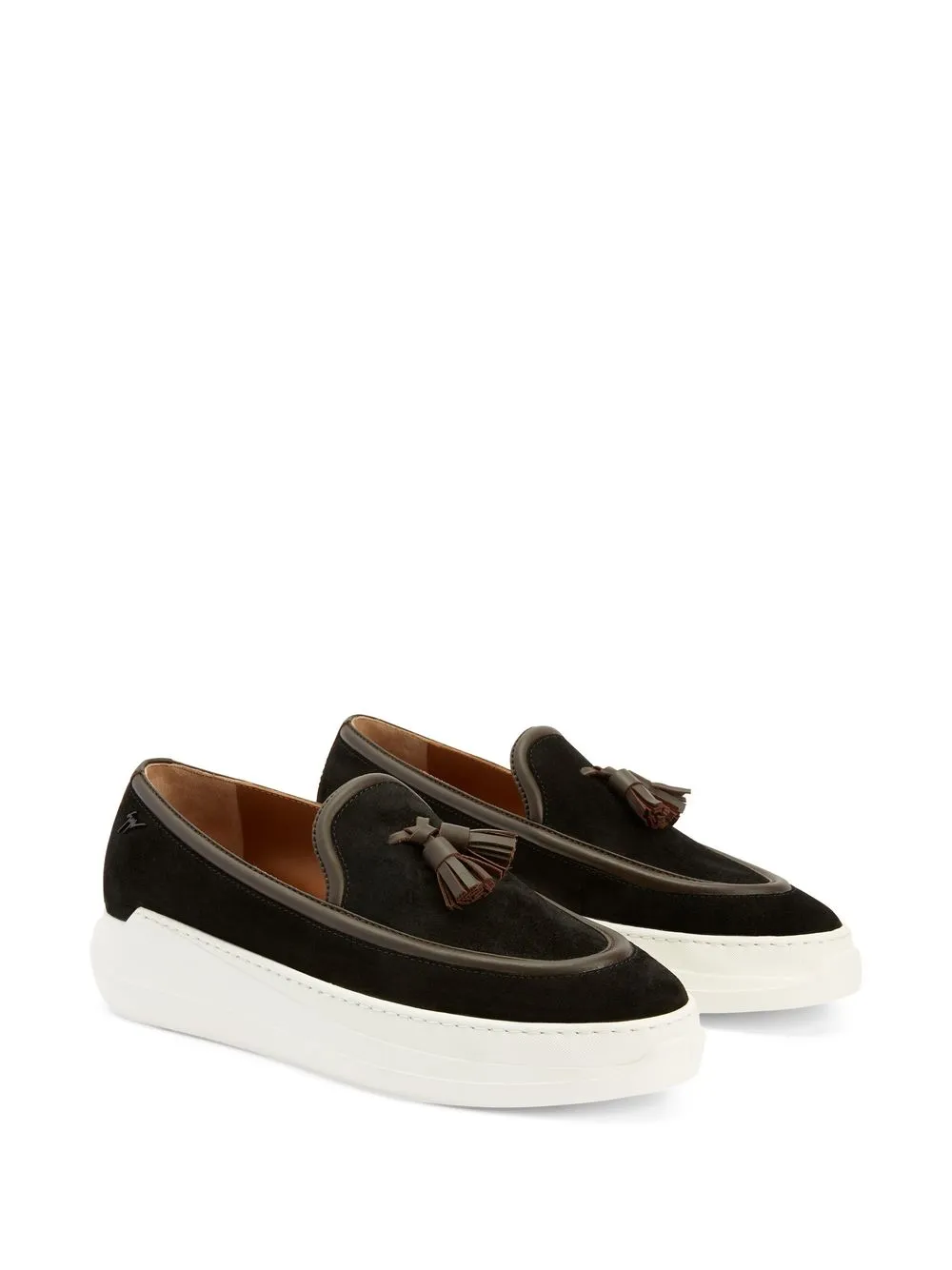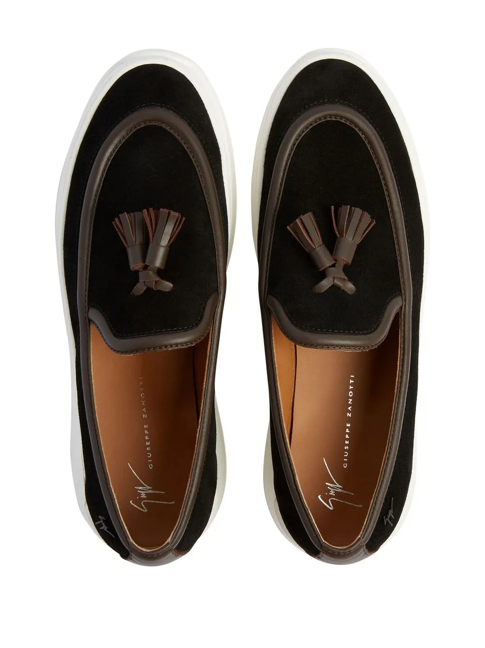 Conley tassel suede loafers from Giuseppe Zanotti featuring black, brown, suede, leather, contrasting trim, tassel detail, almond toe, branded insole and chunky rubber sole.