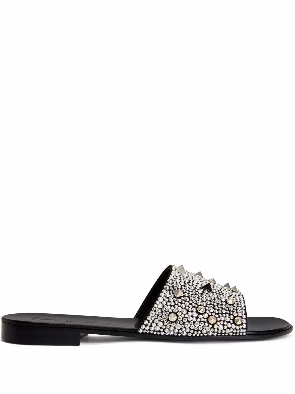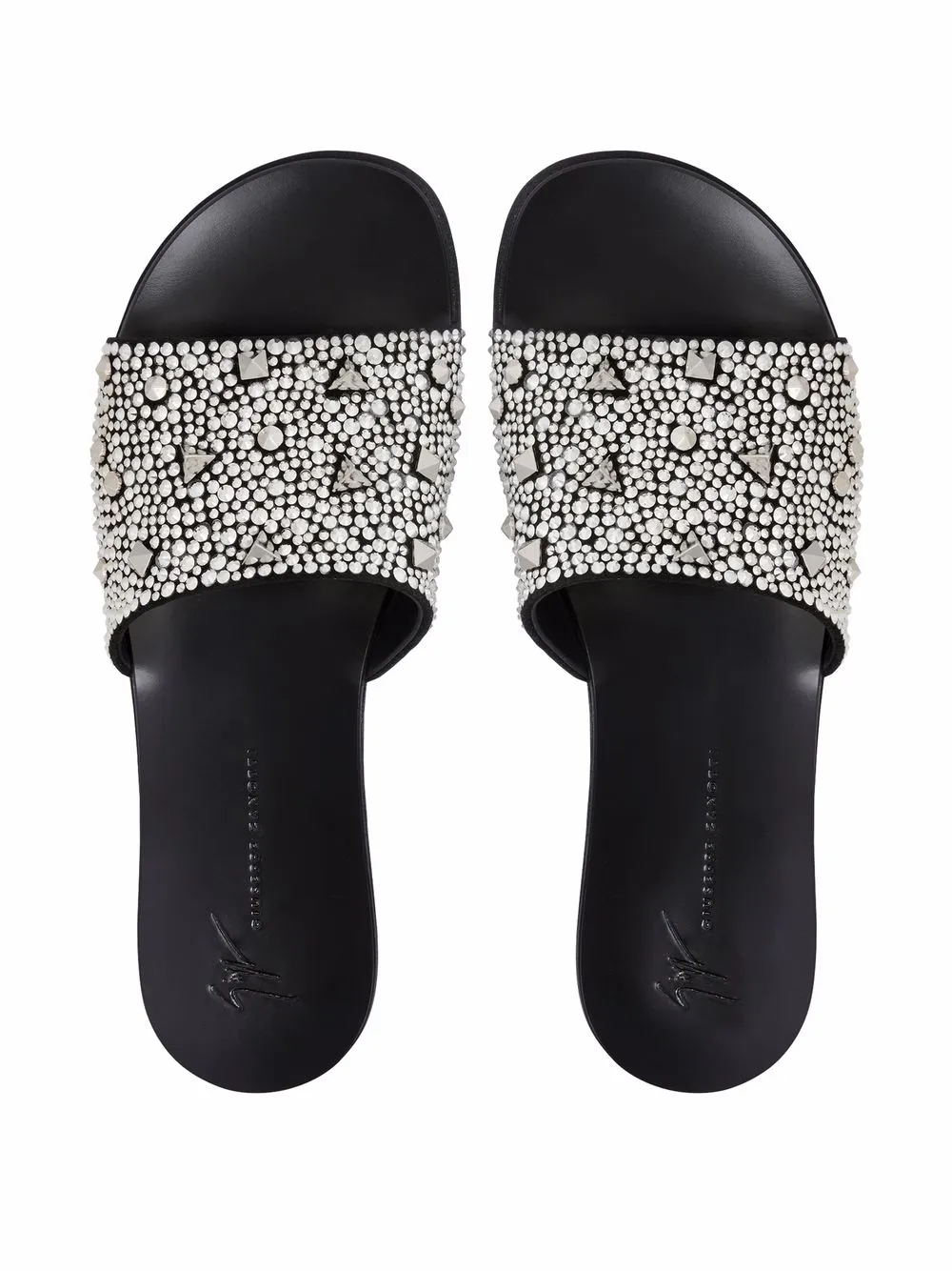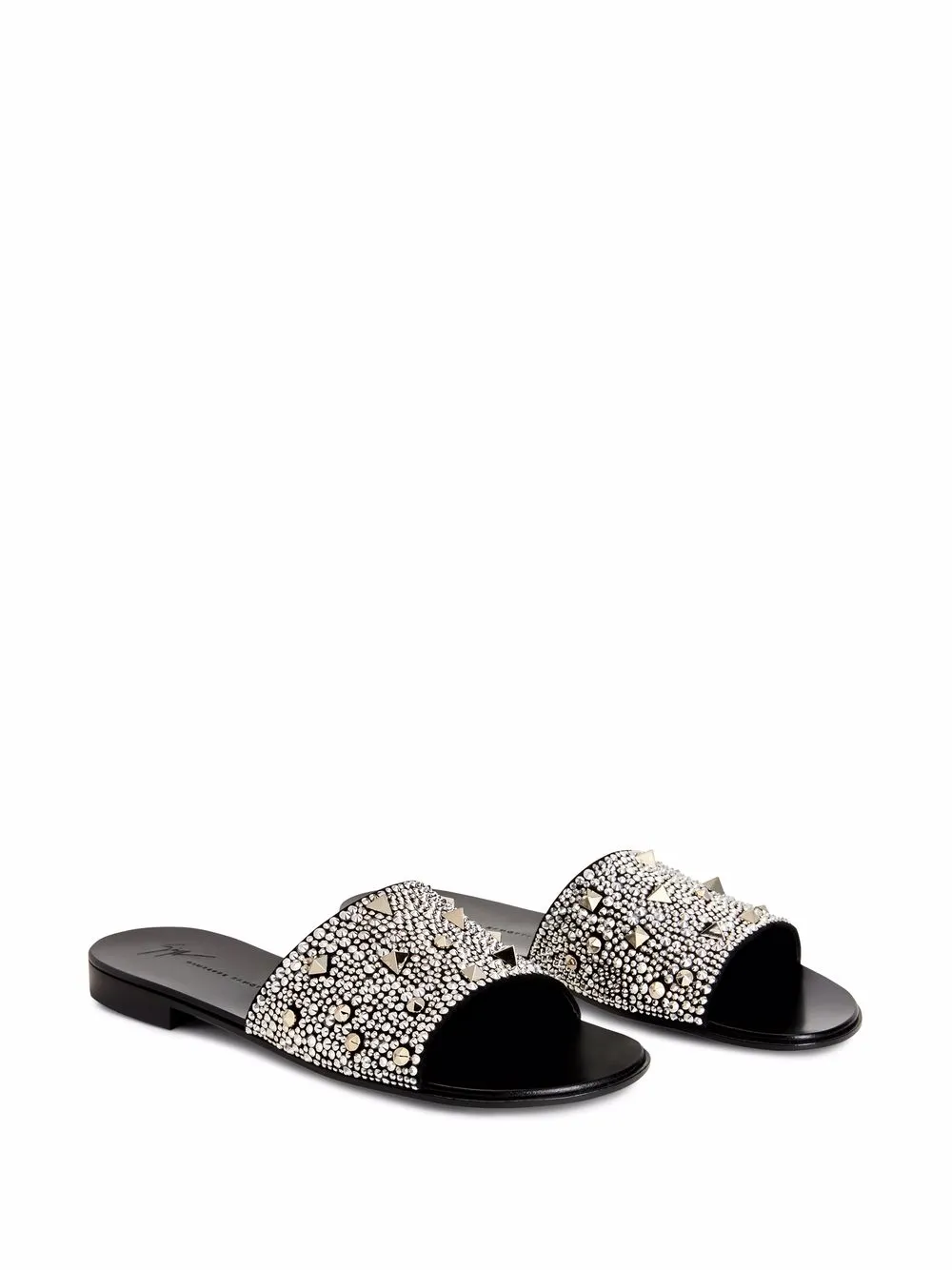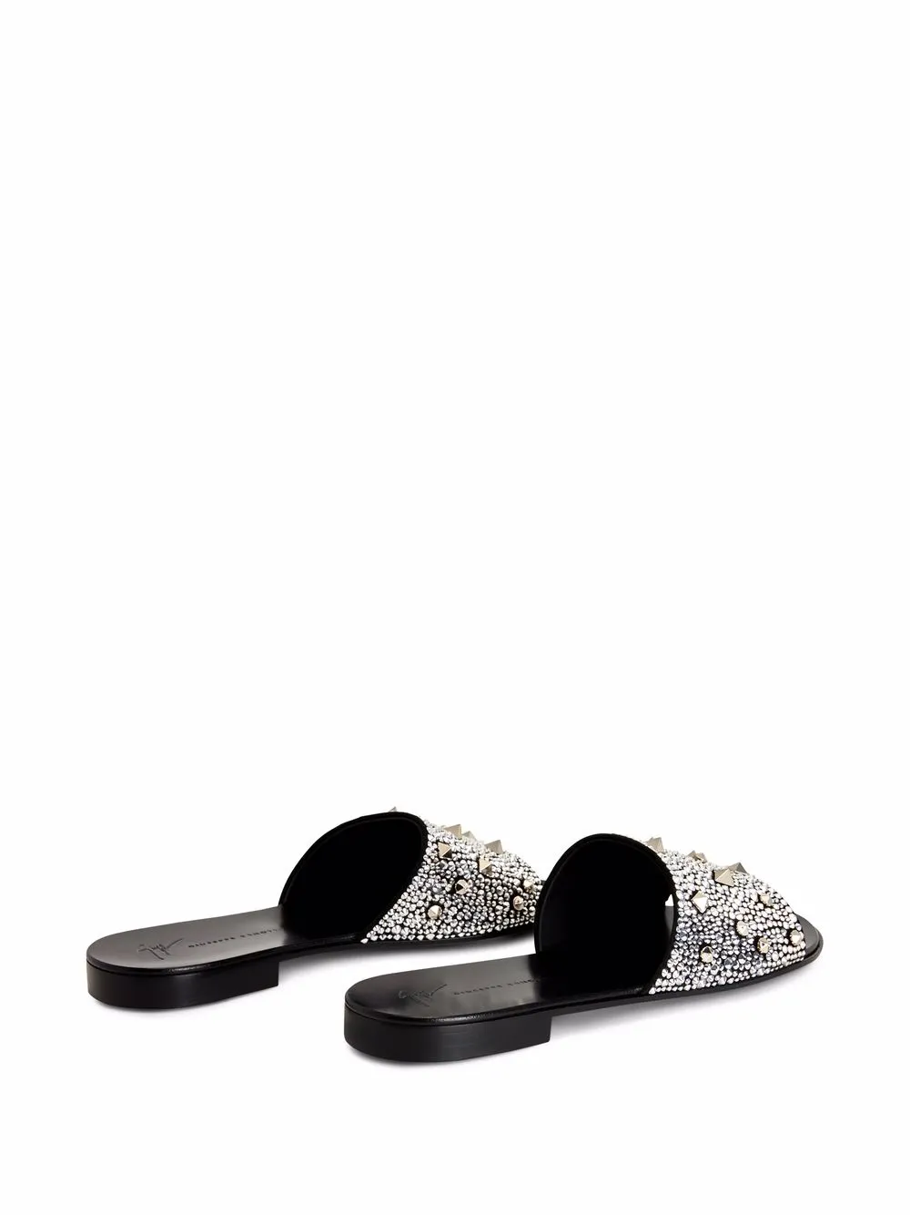 Black suede Darrin encrusted slides from Giuseppe Zanotti featuring open toe, branded leather insole, slip-on style, low heel and encrusted embellishments.