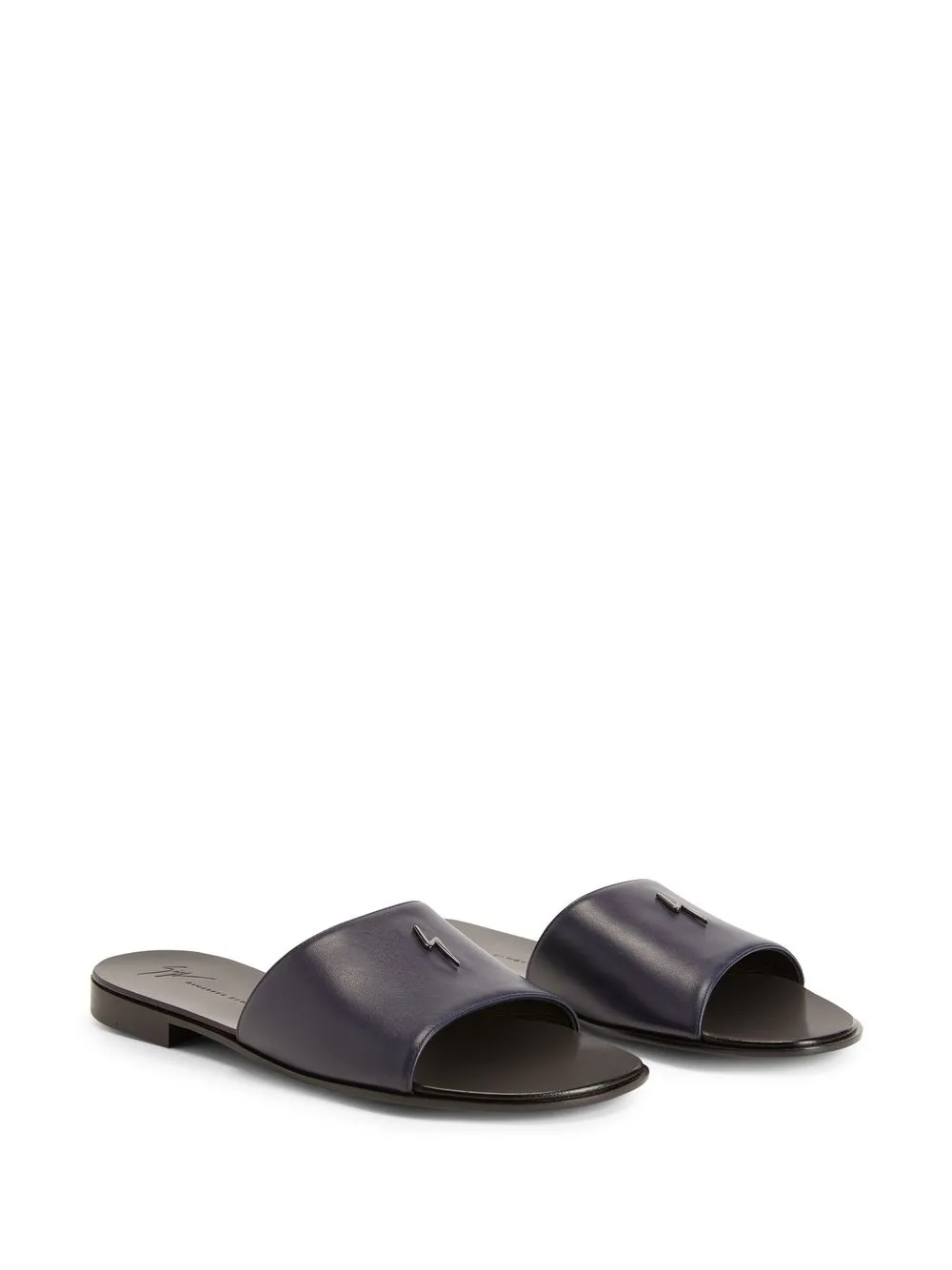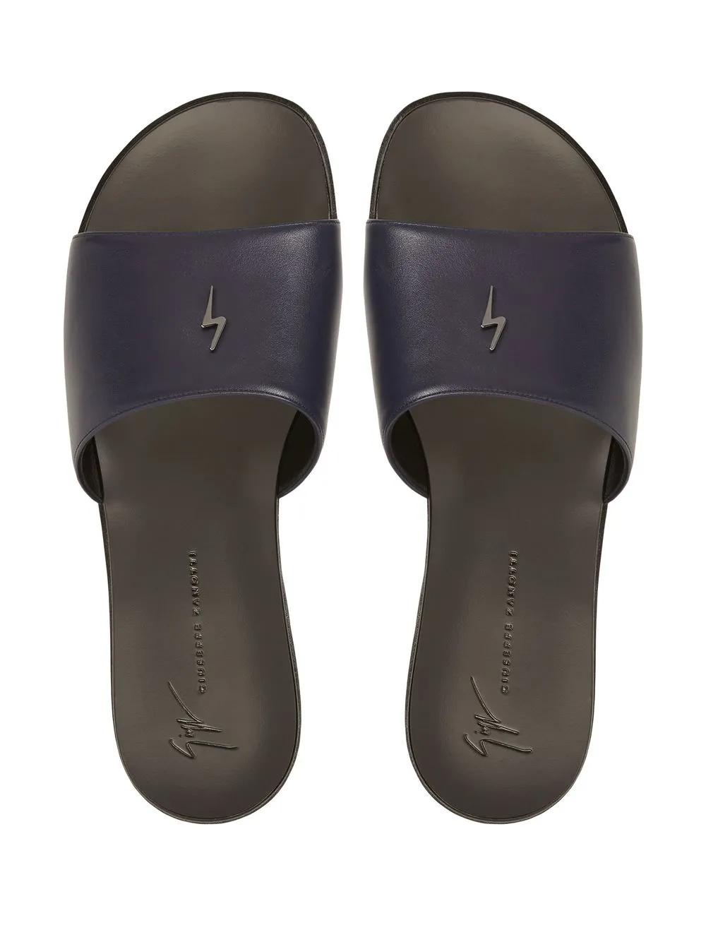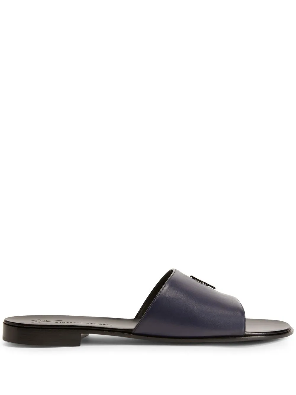Darrin Flash slides from Giuseppe Zanotti featuring blue, leather, open toe, silver-tone logo plaque and flat sole.