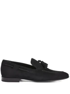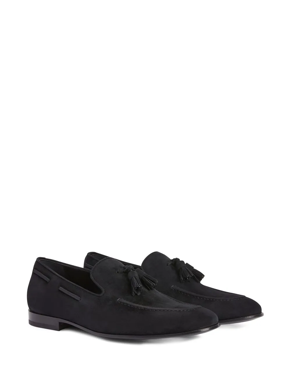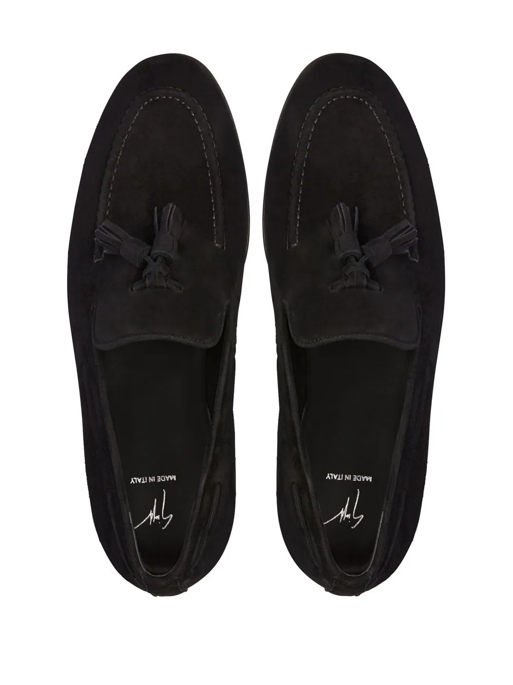 Eloys tassle-detail loafer from Giuseppe Zanotti featuring black, leather, suede, large tassel detail, almond toe, low heel, branded insole and slip-on style.