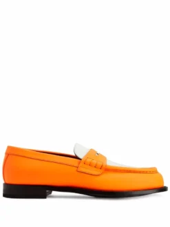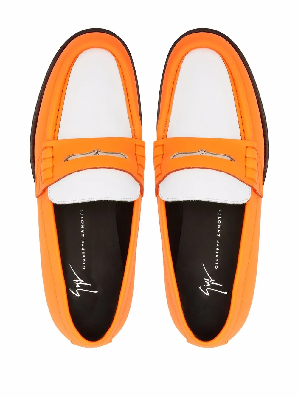 Orange/white leather Euro two-tone leather loafers from Giuseppe Zanotti featuring slip-on style, two-tone design, penny slot, almond toe, branded leather insole and flat sole.