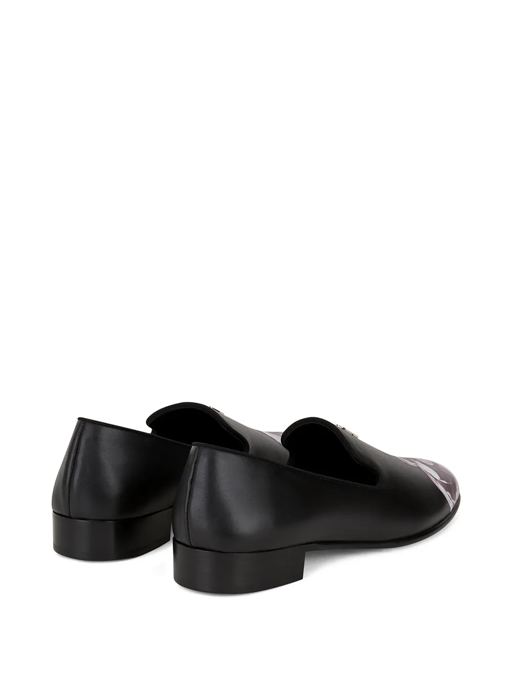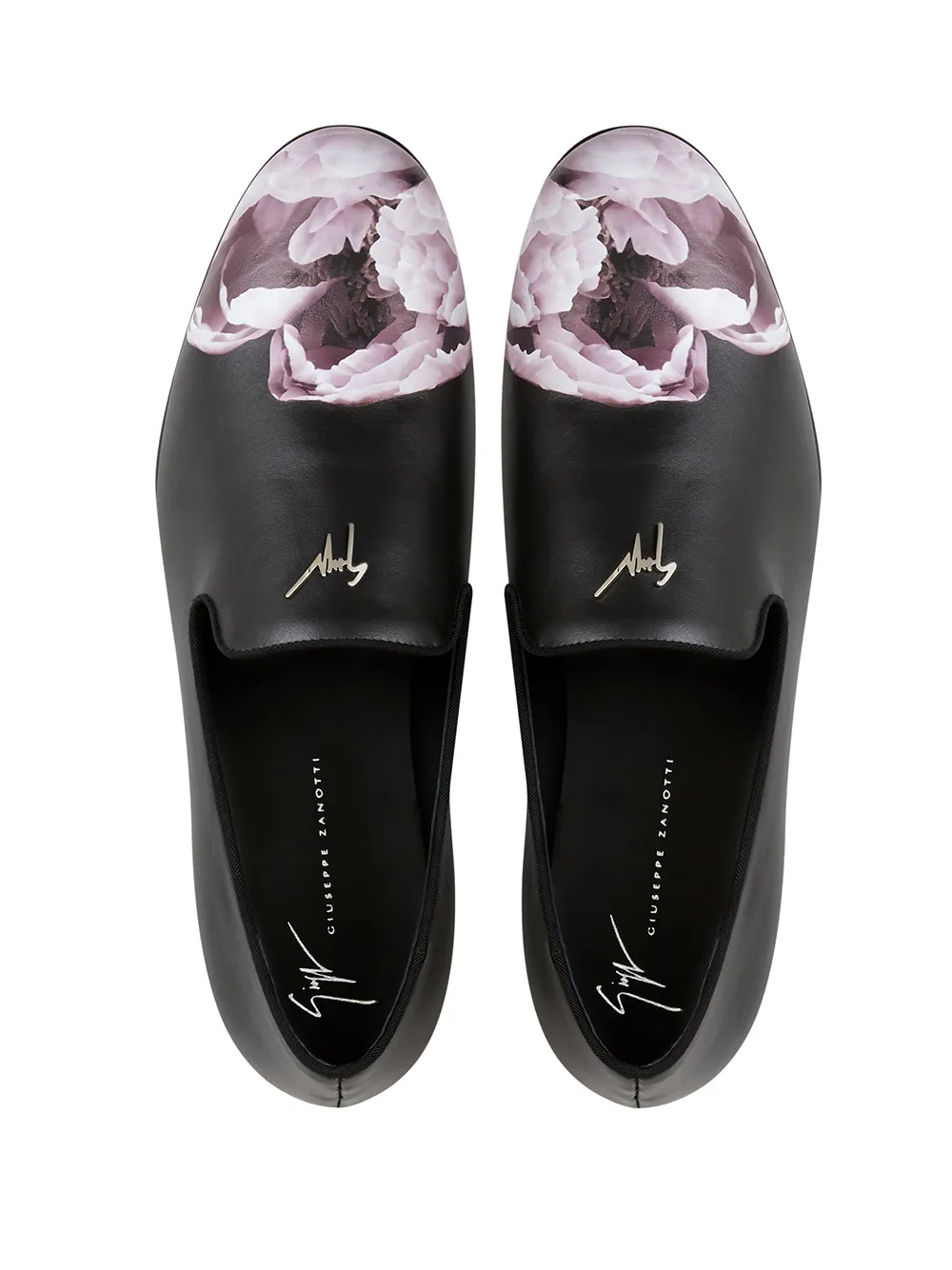 Black/multicoloured leather Forever Bloom leather loafers from Giuseppe Zanotti featuring floral print, silver-tone logo lettering, round toe, slip-on style, branded insole and flat leather sole.