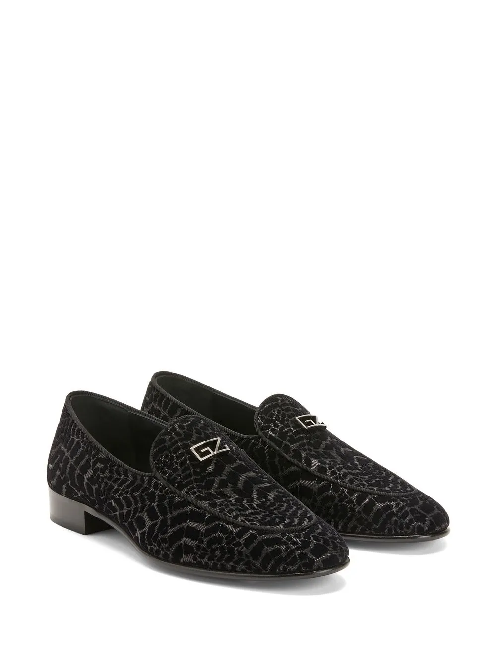 GZ Rudolph leather loafers from Giuseppe Zanotti featuring black, leather, abstract pattern print, almond toe, logo plaque, almond toe, branded insole and flat rubber sole.