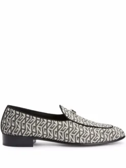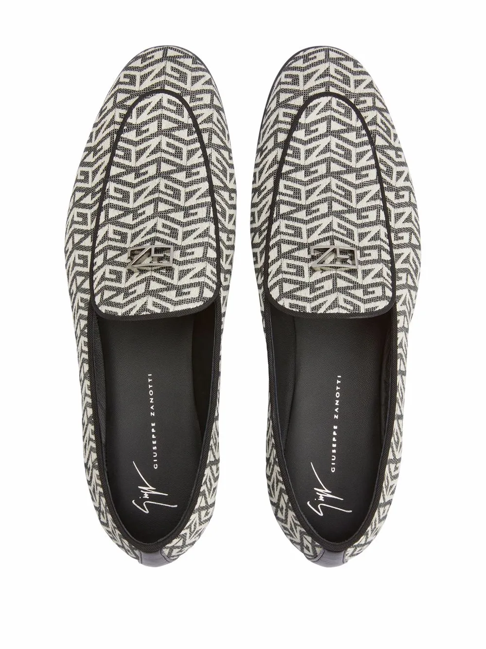 White/black leather GZ Rudolph monogram-print loafers from Giuseppe Zanotti featuring monogram pattern, logo plaque, almond toe, branded insole, flat rubber sole and low block heel.
