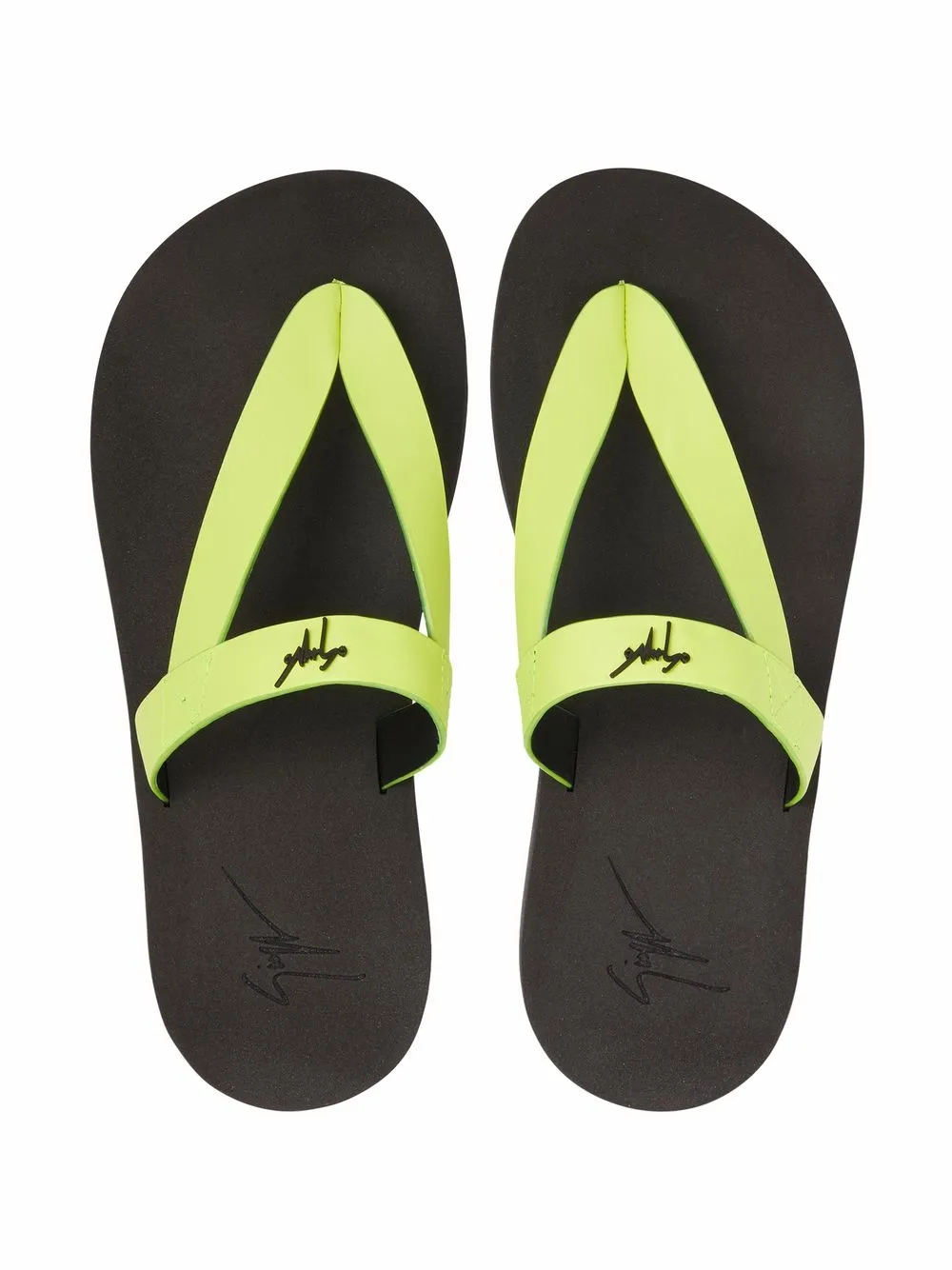 Black/yellow leather Hydra leather-trim flip-flops from Giuseppe Zanotti featuring logo plaque, T-bar strap, branded leather insole, slip-on style and flat rubber sole.