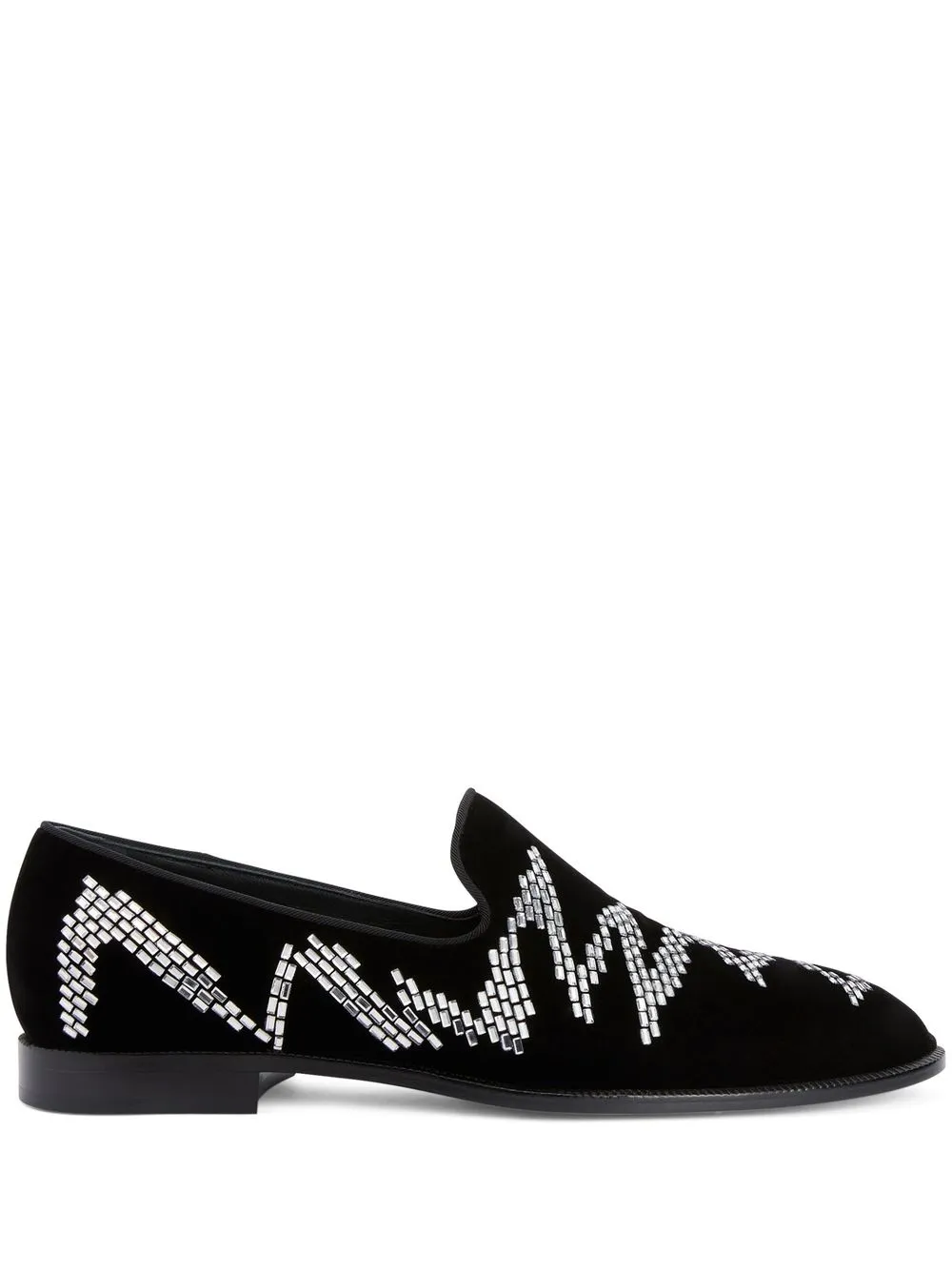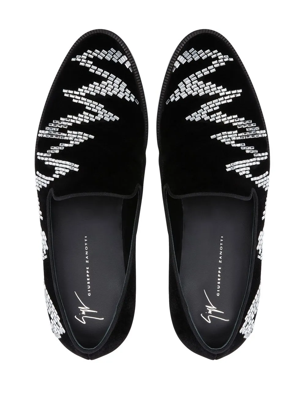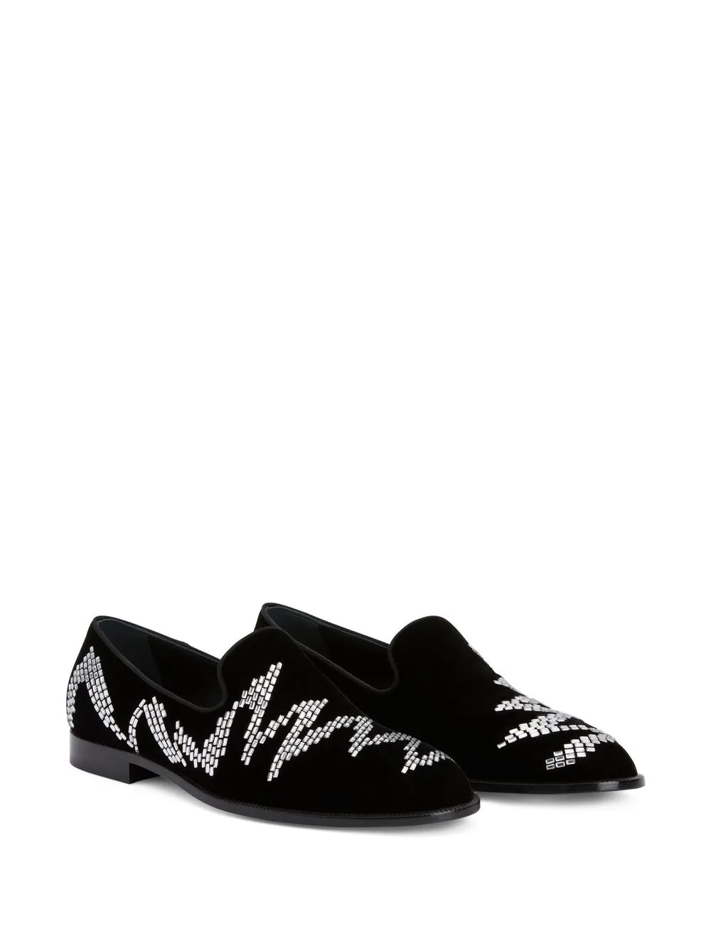 Jareth Shake loafers from Giuseppe Zanotti featuring black, leather, velvet effect, rhinestone embellishment, almond toe, branded insole and flat rubber sole.