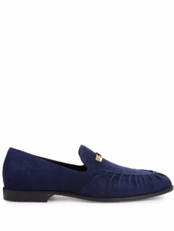 Navy suede Jareth suede loafers from Giuseppe Zanotti featuring almond toe, gold-tone logo plaque, slip-on style, low block heel and branded leather insole.