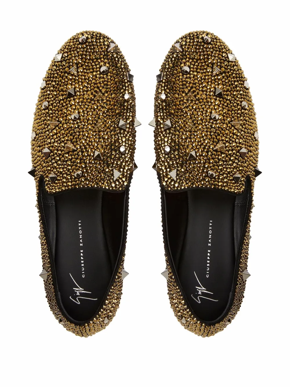 Gold/black leather/suede Lewis embellished studded loafers from Giuseppe Zanotti featuring crystal embellishment, stud detailing, round toe, branded insole, flat rubber sole and low block heel.
