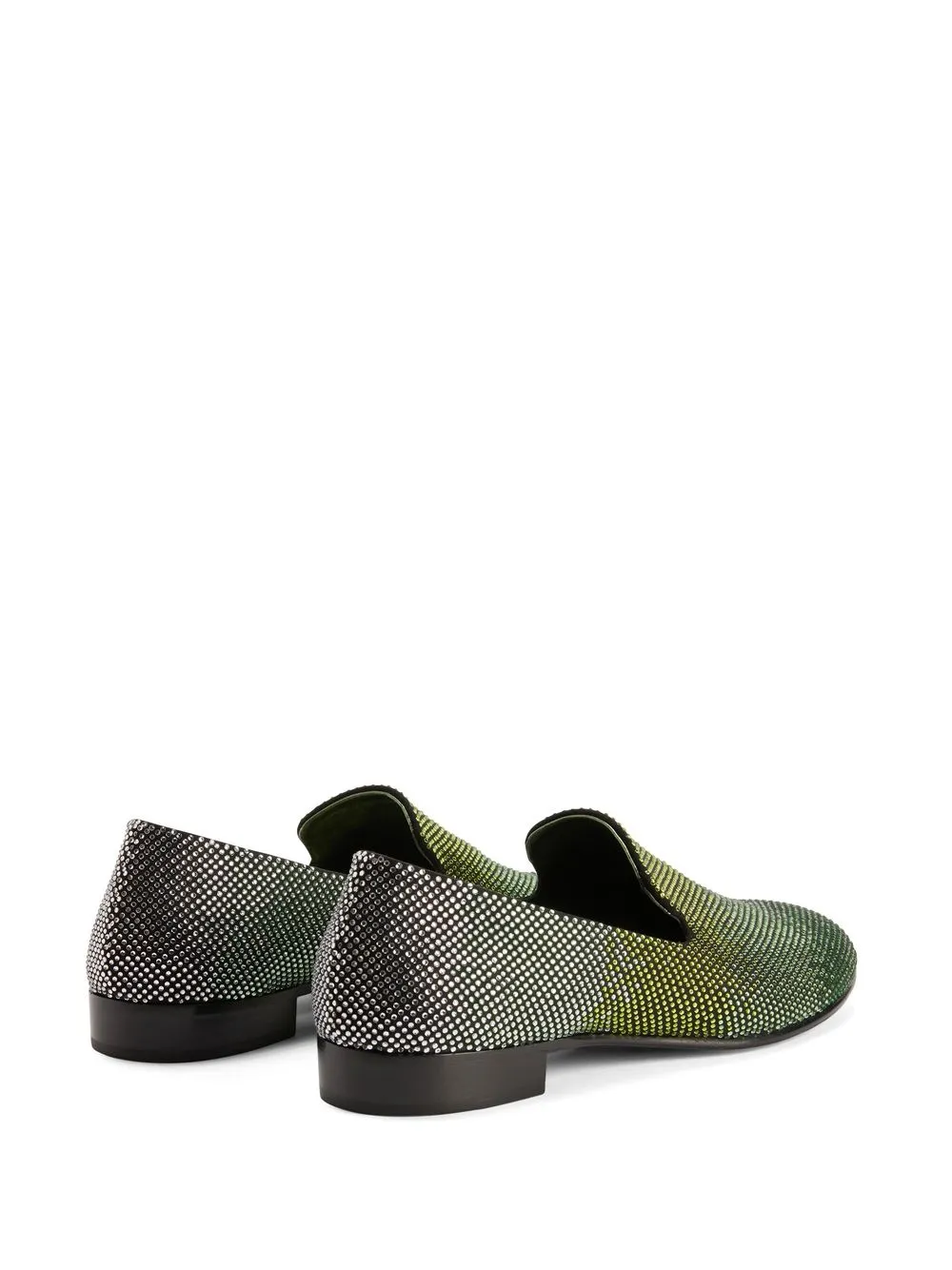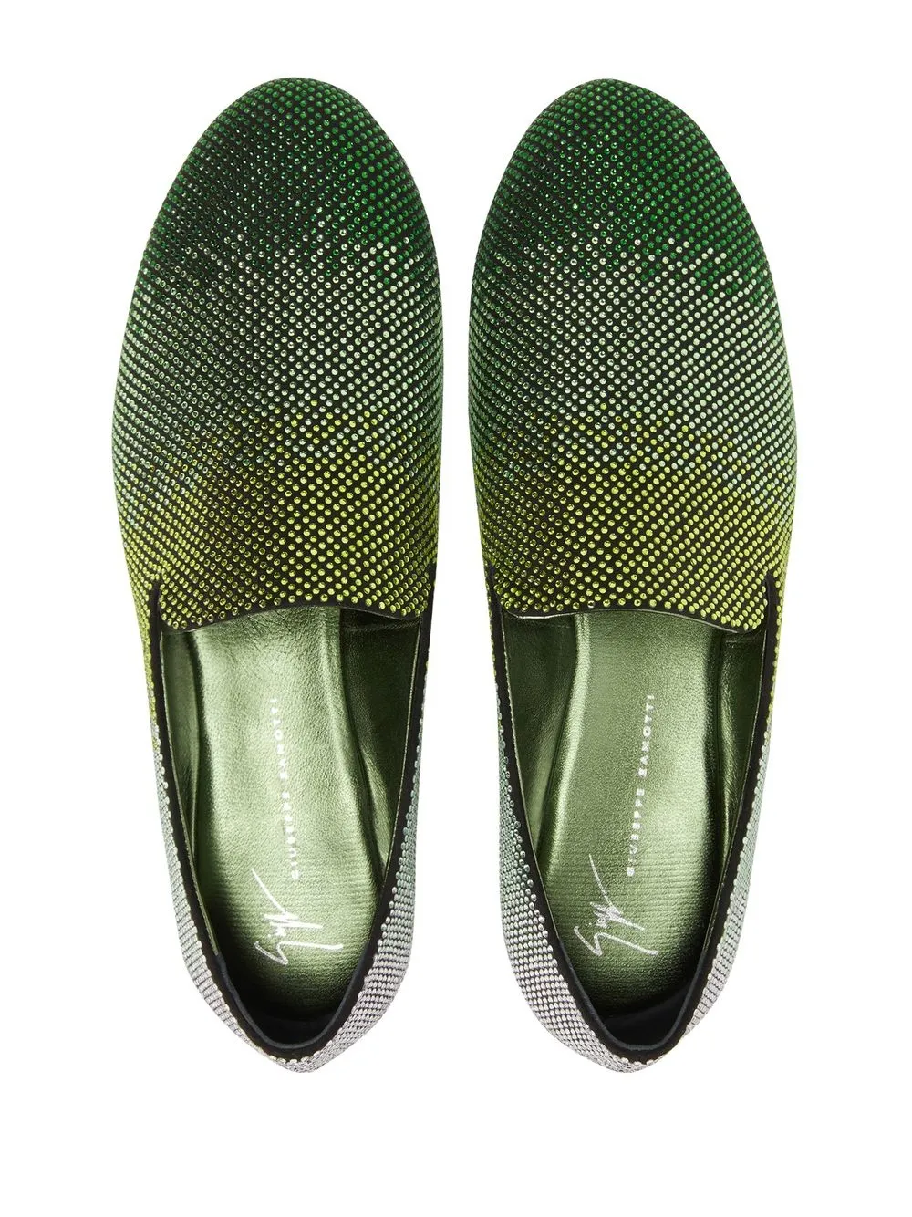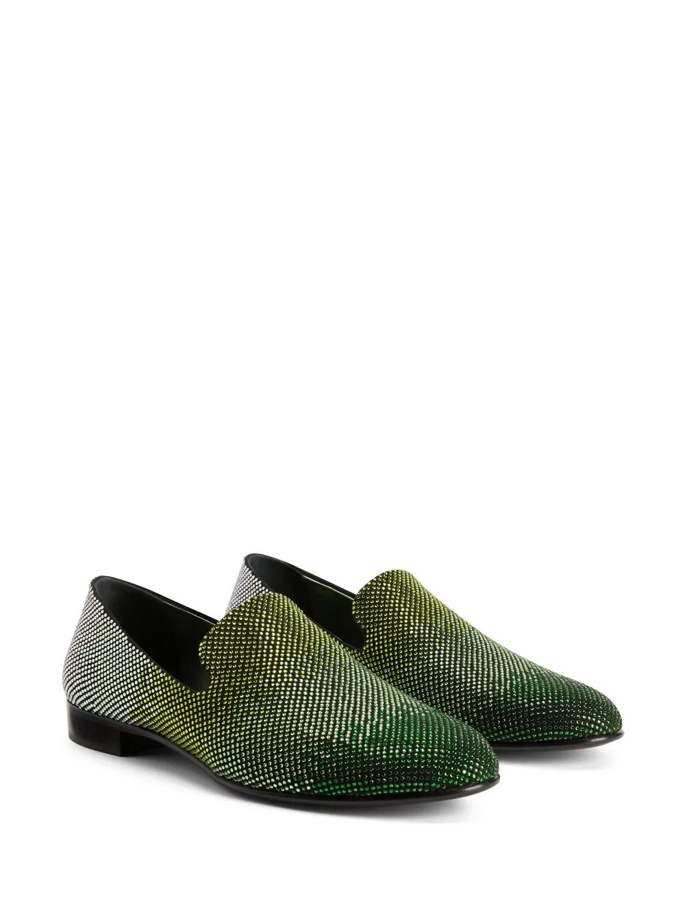 Lewis rhinestone loafers from Giuseppe Zanotti featuring bright green, multicolour, calf suede, calf leather, rhinestone embellishment, branded insole, almond toe, slip-on style and low heel.