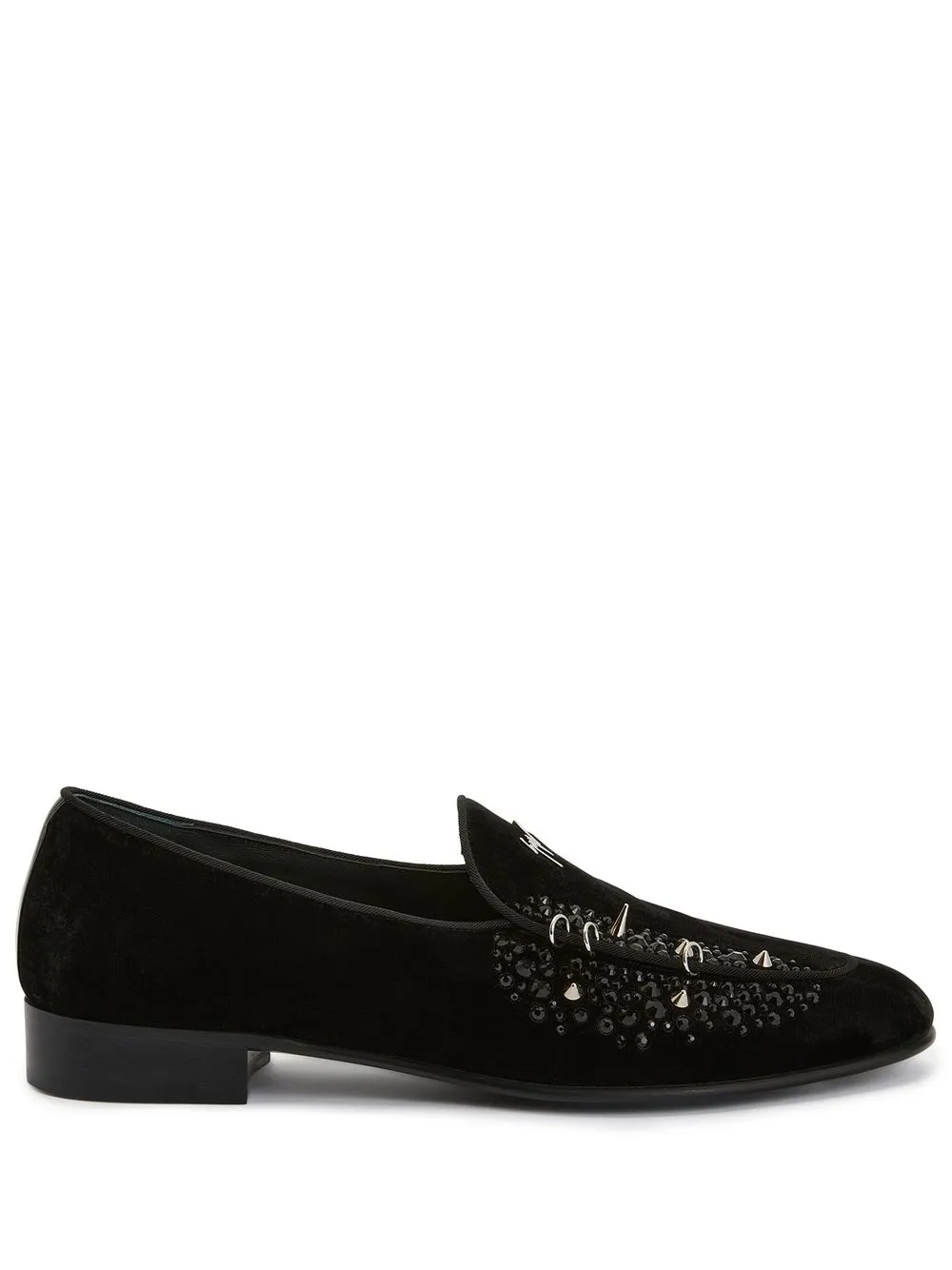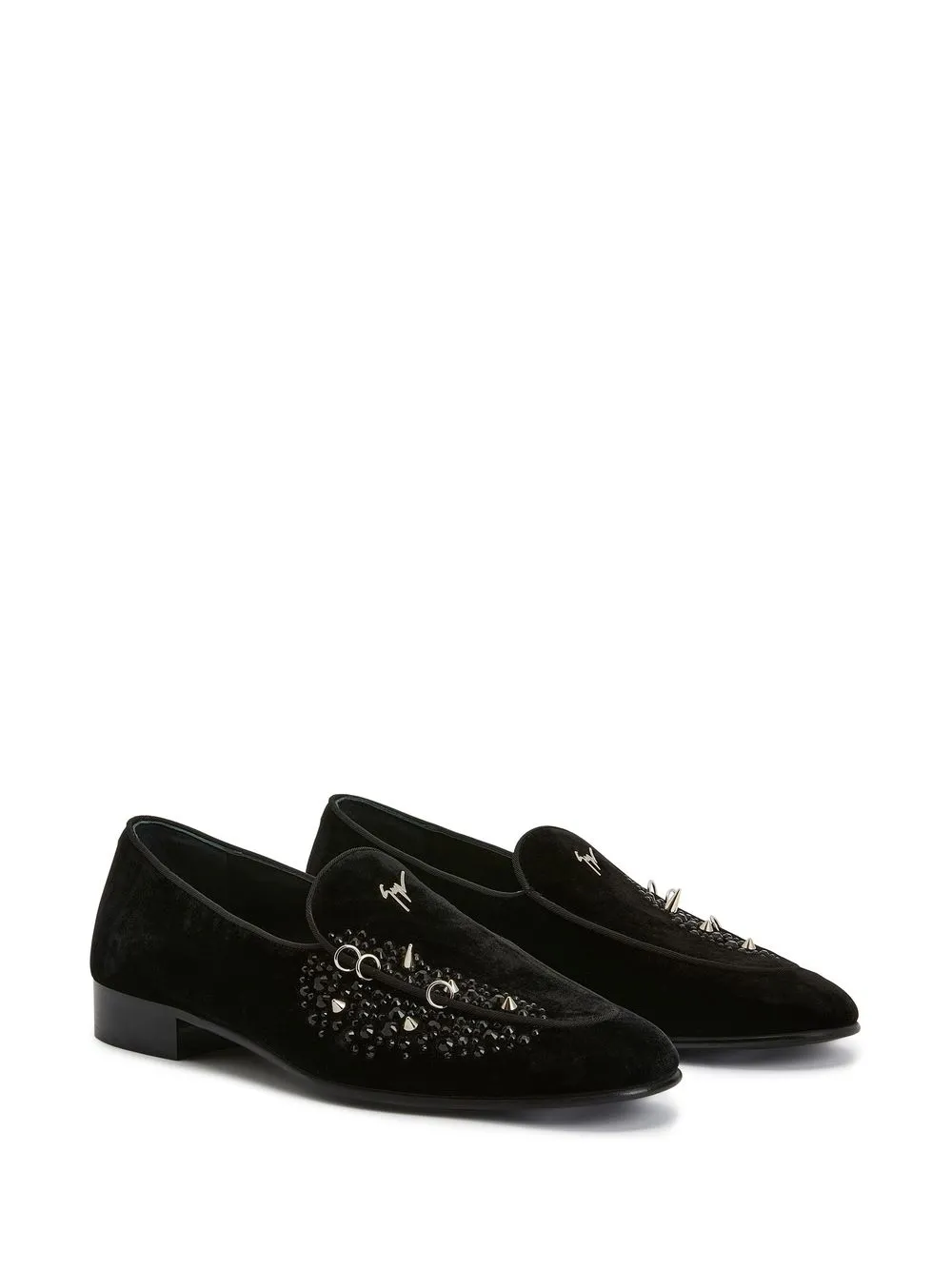studded velvet loafers from Giuseppe Zanotti featuring black, velvet effect, stud detailing, branded insole, almond toe, slip-on style and low heel.