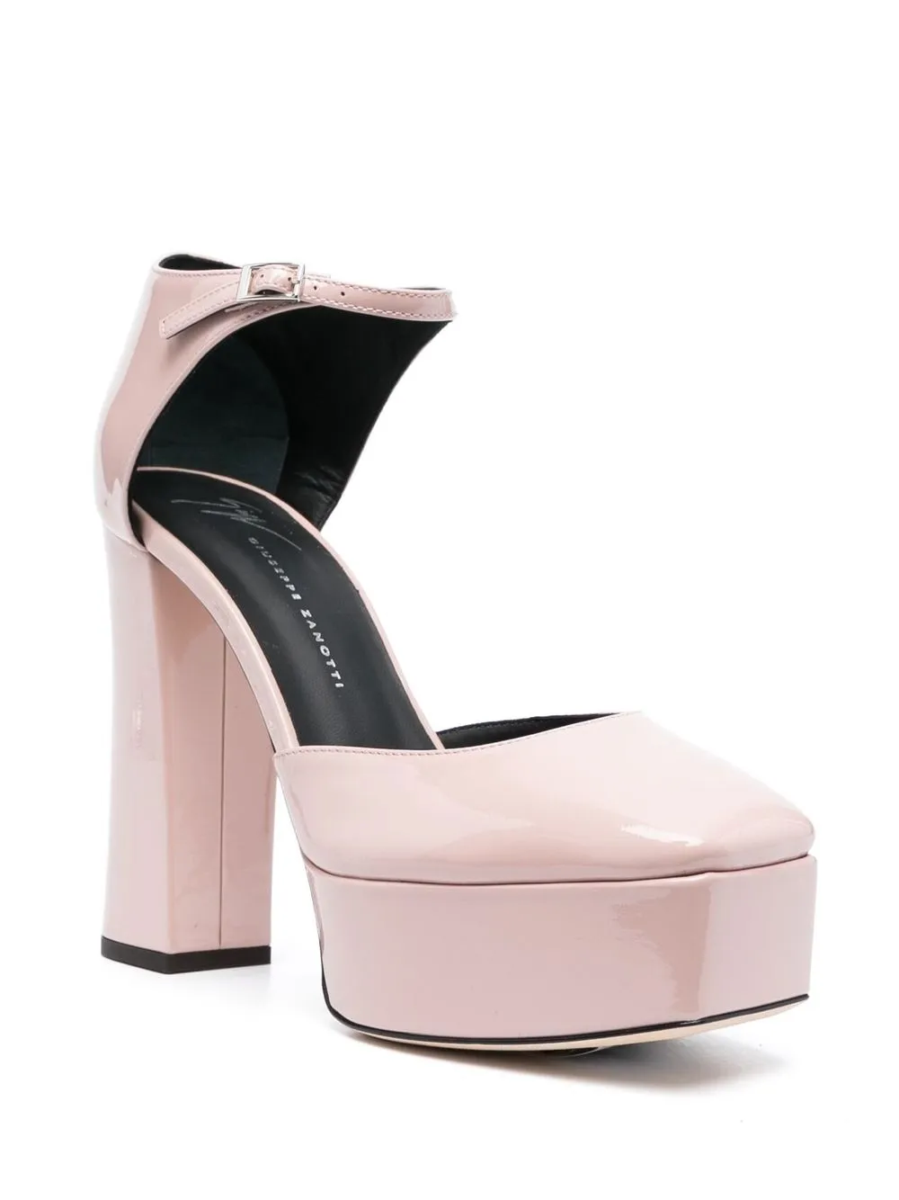 120mm patent leather pumps from Giuseppe Zanotti featuring blush pink, calf leather, patent finish, buckle-fastening ankle strap, square toe, branded leather insole, platform sole and high block heel.