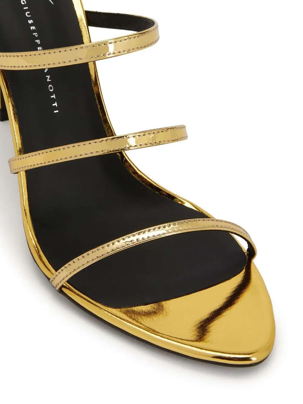 Alimha 105mm stiletto sandals from Giuseppe Zanotti featuring gold-tone, calf leather, leather, open toe, slip-on style, stiletto heel and branded insole.