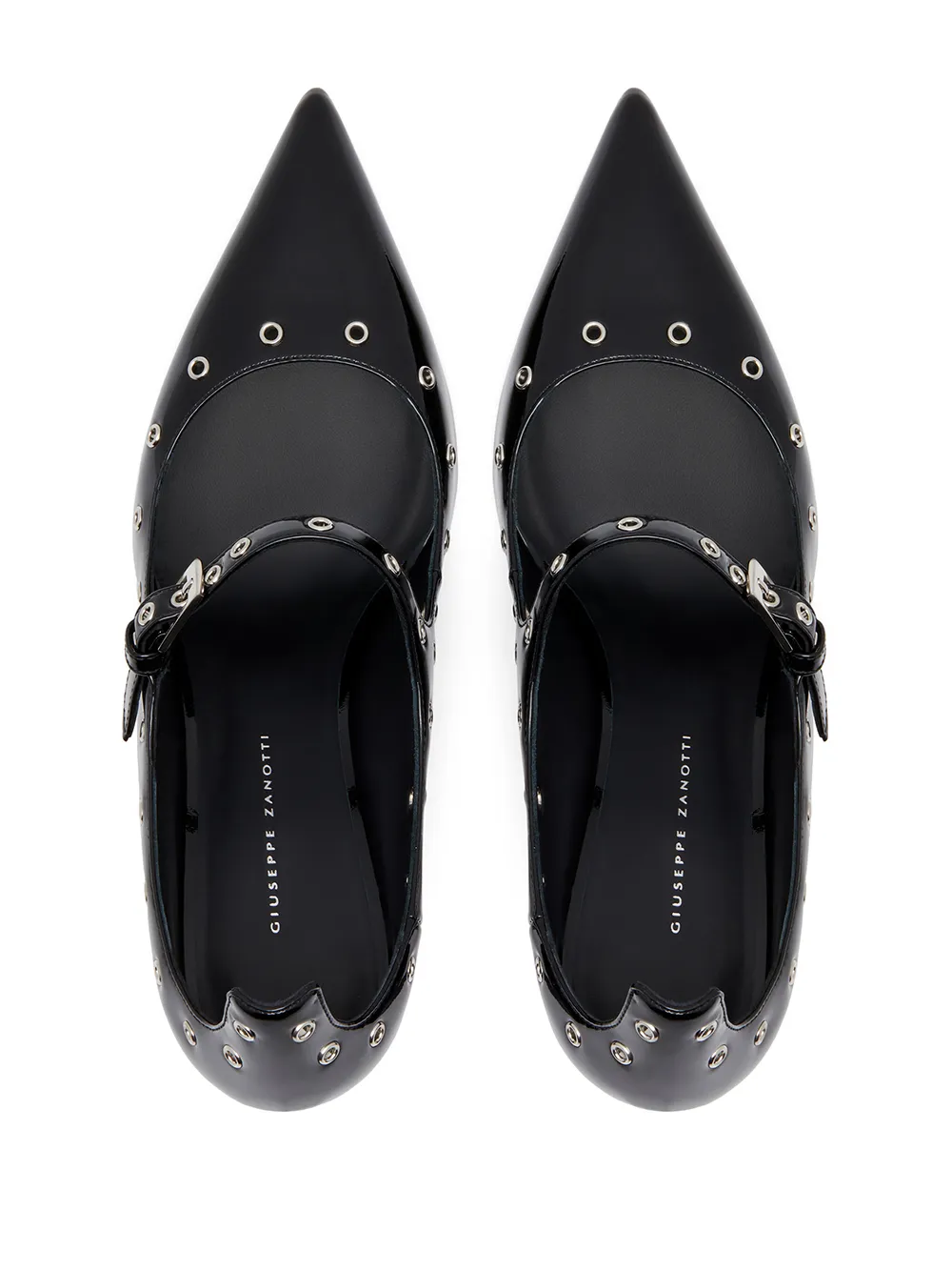 Black leather/patent leather Alyson Cut eyelet pumps from Giuseppe Zanotti featuring eyelet detailing, pointed toe, strap and buckle fastening, branded insole and high stiletto heel.