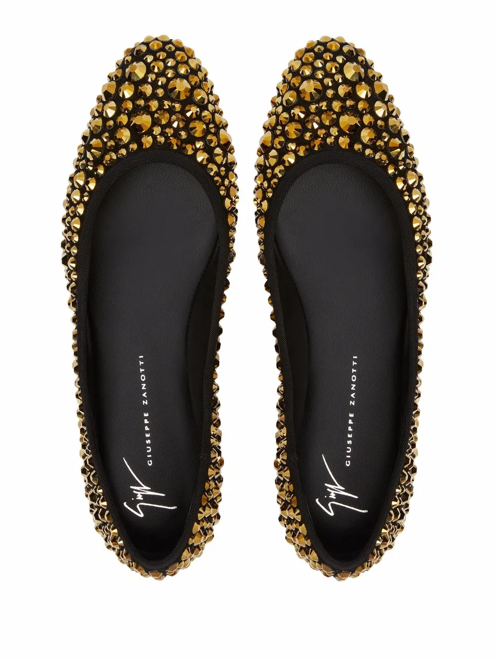 Giuseppe Zanotti is an Italian footwear and fashion designer, master in combining different details to create new and sleek designs. Crafted from suede and leather, the Amur ballerina shoes stand out not only for their high-end construction but for the rhinestone embellishments all over.