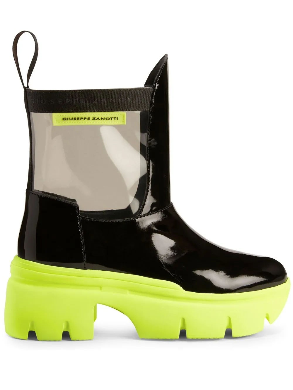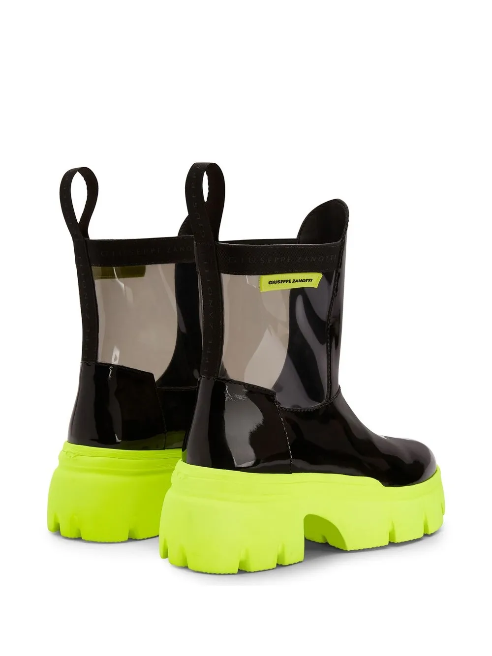 Apocalypse Riot chunky boots from Giuseppe Zanotti featuring black, fluorescent green, high-shine finish, transparent panel detail, logo patch to the side, logo-tape detailing, logo pull-tab at the heel, round toe, low block heel, chunky rubber lug sole and pull-on style.