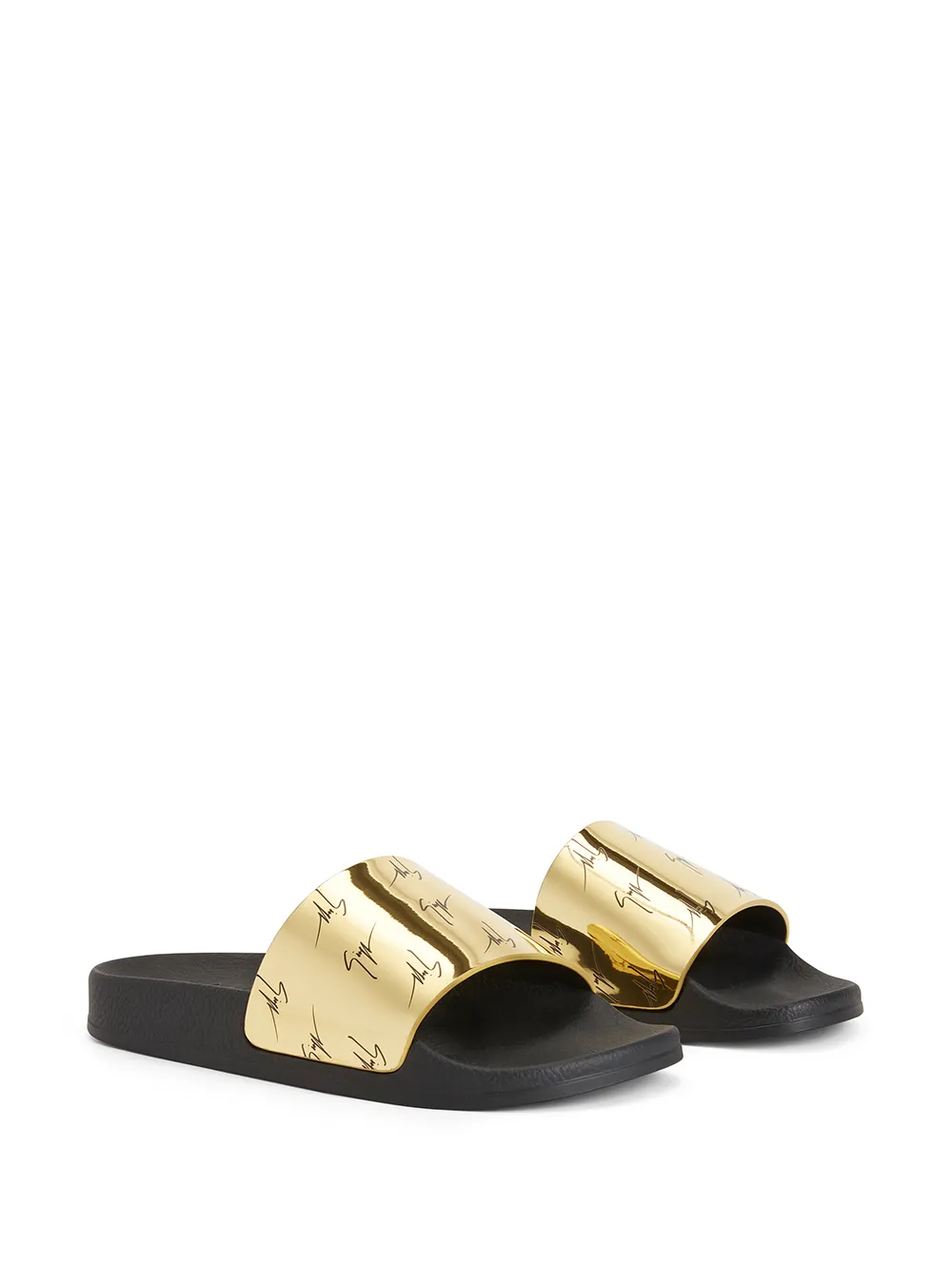 Gold-tone Brett all-over logo slides from Giuseppe Zanotti featuring metallic effect, monogram pattern, open toe, flat rubber sole and slip-on style.