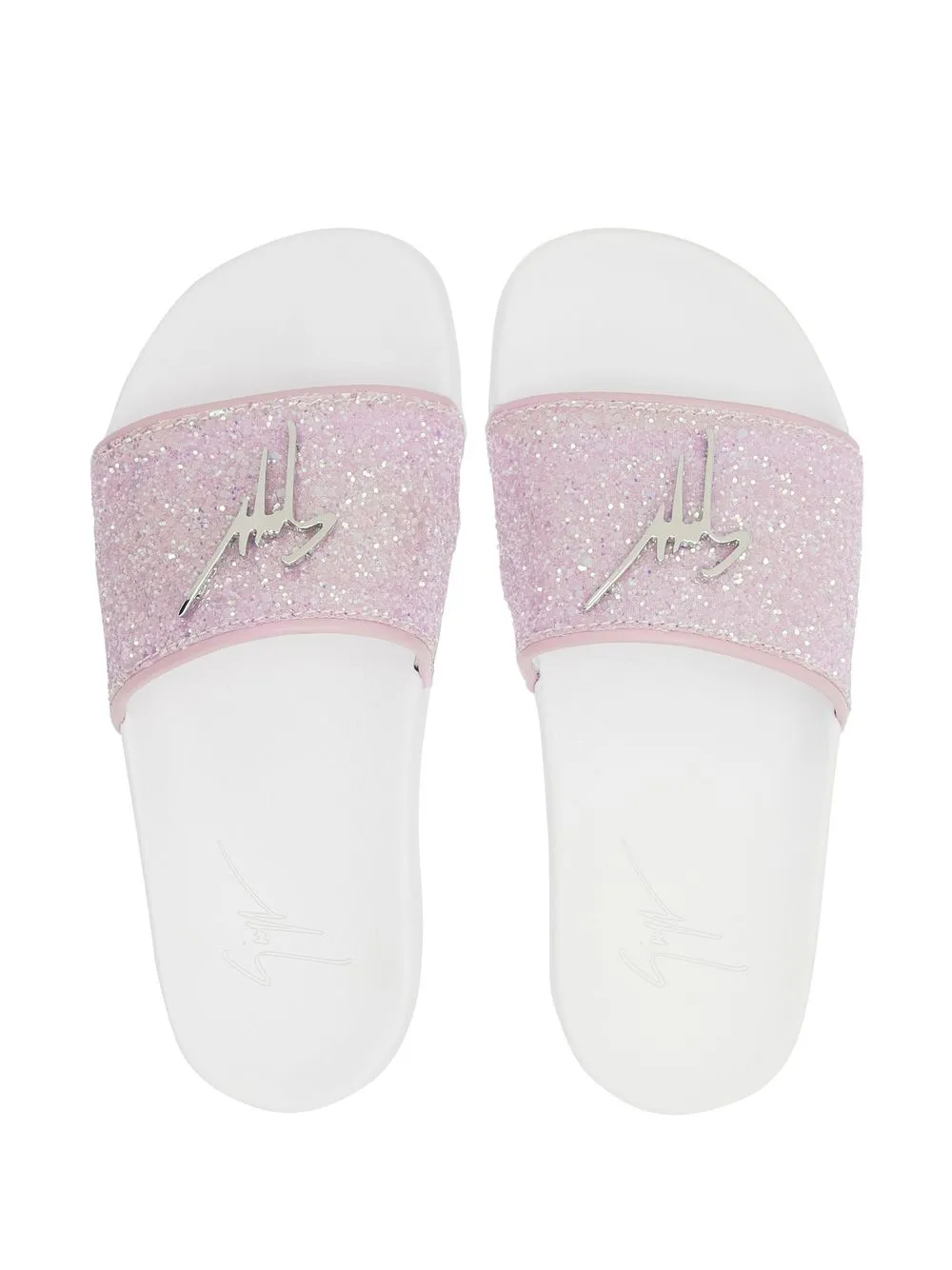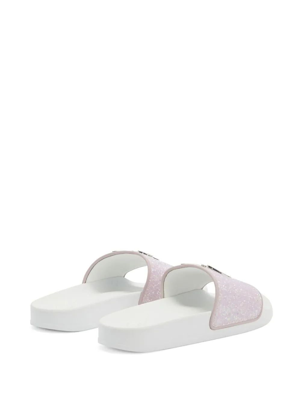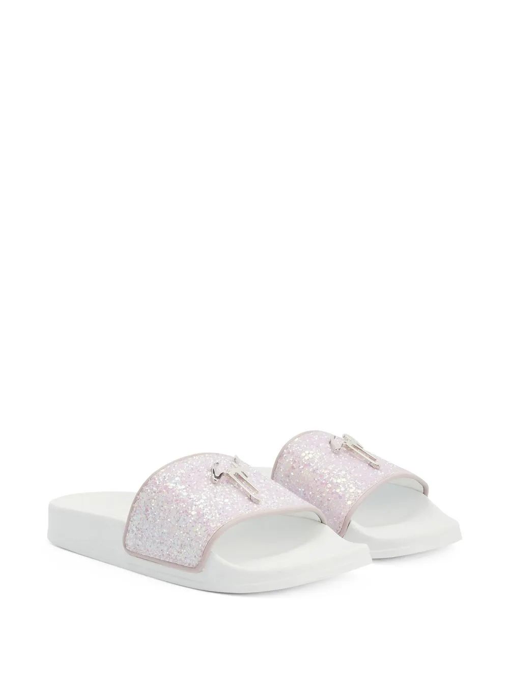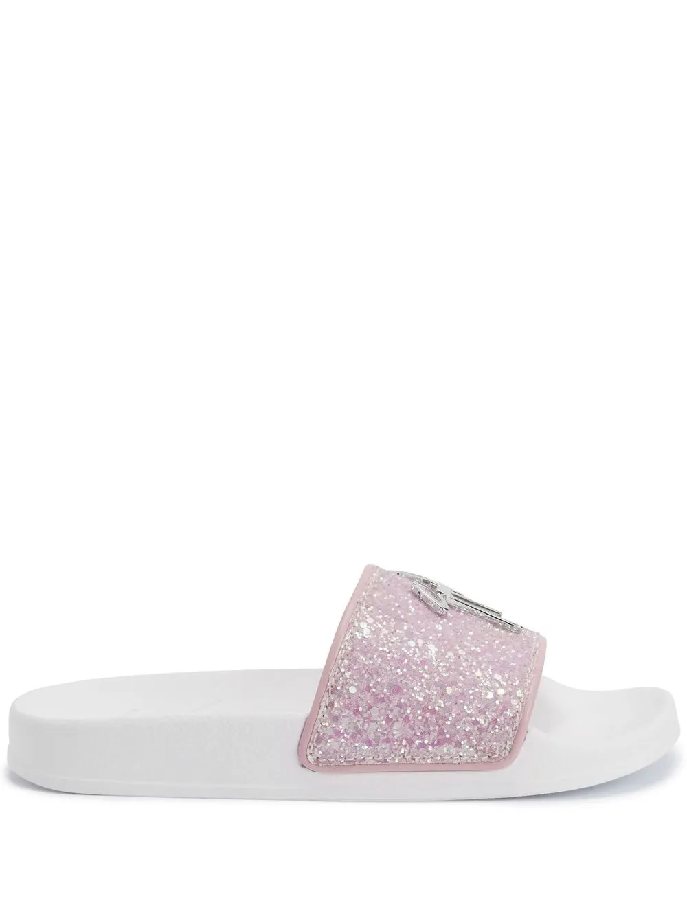 Brett glitter-detail slide sandals from Giuseppe Zanotti featuring pink, white, glitter detailing, silver-tone logo plaque, open toe, rubber sole and slip-on style.