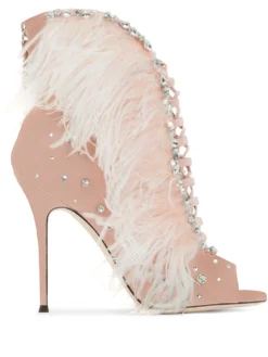 Renowned for a more is more approach to shoe design, these Charleston boots from Giuseppe Zanotti feature multi-layered embellishment. Textural detailing of feather trim, crystal embellishment and an open-toe silhouette play into the superlative glamour of the brand.