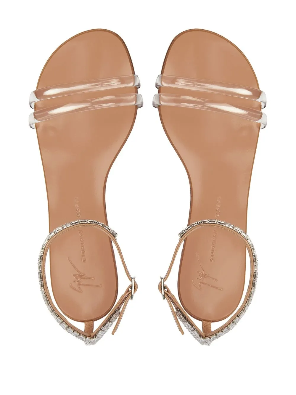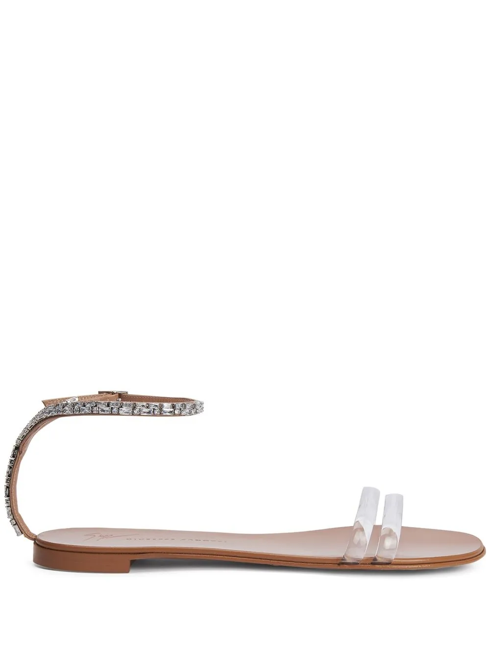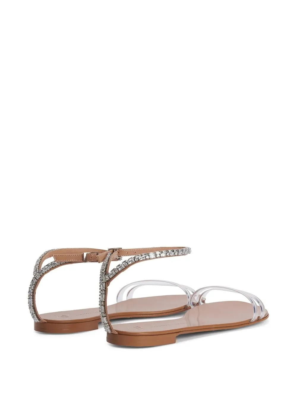 crystal-embellished flat sandals from Giuseppe Zanotti featuring silver, crystal embellishment, open toe, single toe strap, buckle-fastening ankle strap, flat rubber sole and low heel.