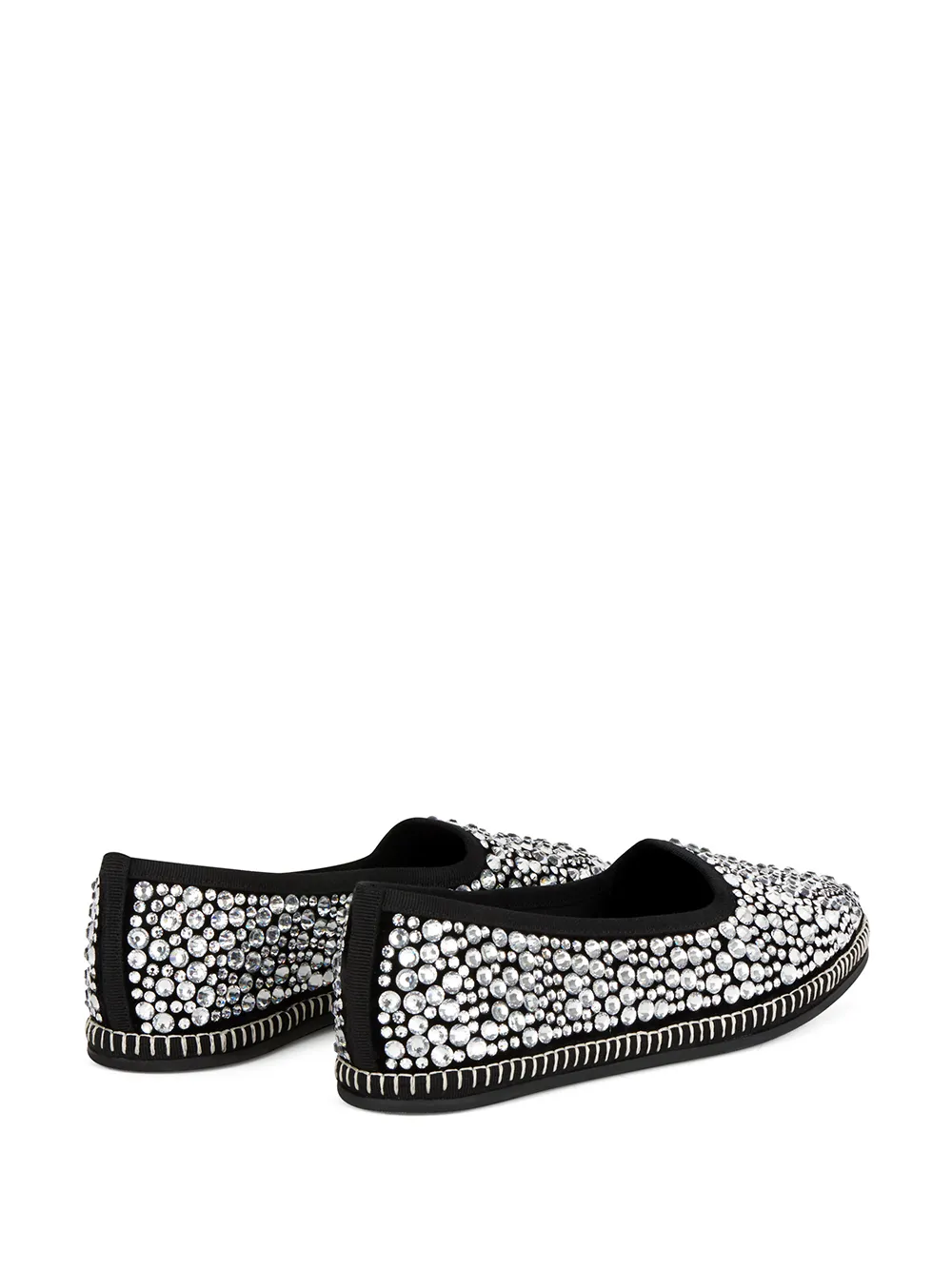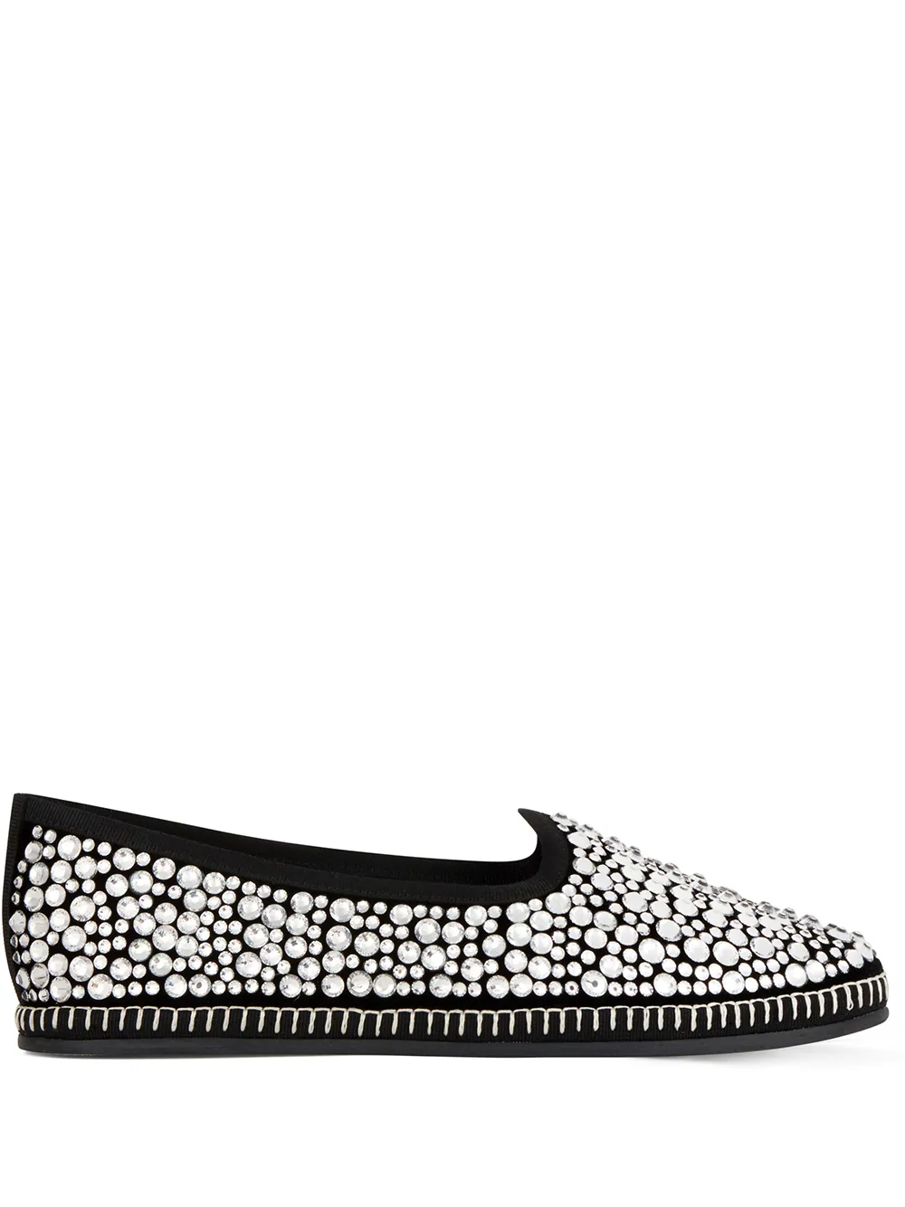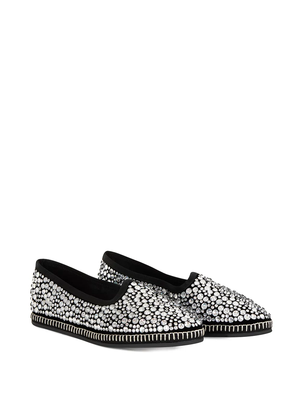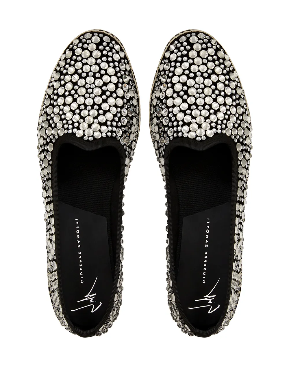 Black velvet/crystal crystal-embellished loafers from Giuseppe Zanotti featuring crystal embellishment, whipstitch detailing, round toe, branded insole and flat sole.