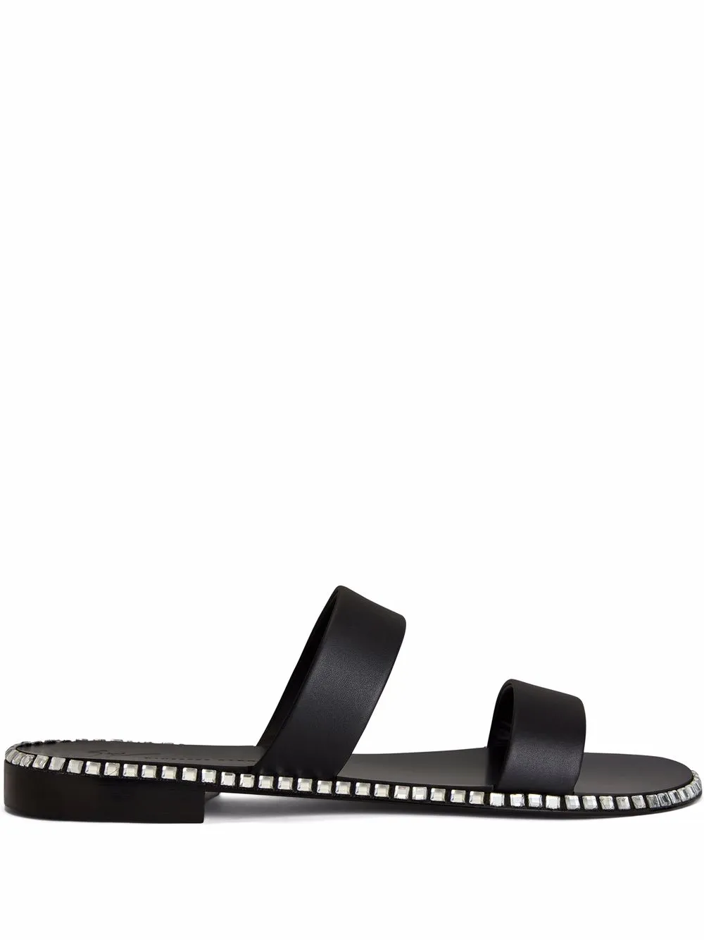 Black leather Elektron stud-embellished strap sandals from Giuseppe Zanotti featuring stud embellishment, double-strap design, open toe, slip-on style and stacked sole.