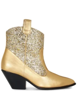 Elna glittery cowboy boots from Giuseppe Zanotti featuring gold-tone, calf leather, metallic effect, glitter detailing, slip-on style, pointed toe, ankle-length, double pull-tab at the opening and low block heel.