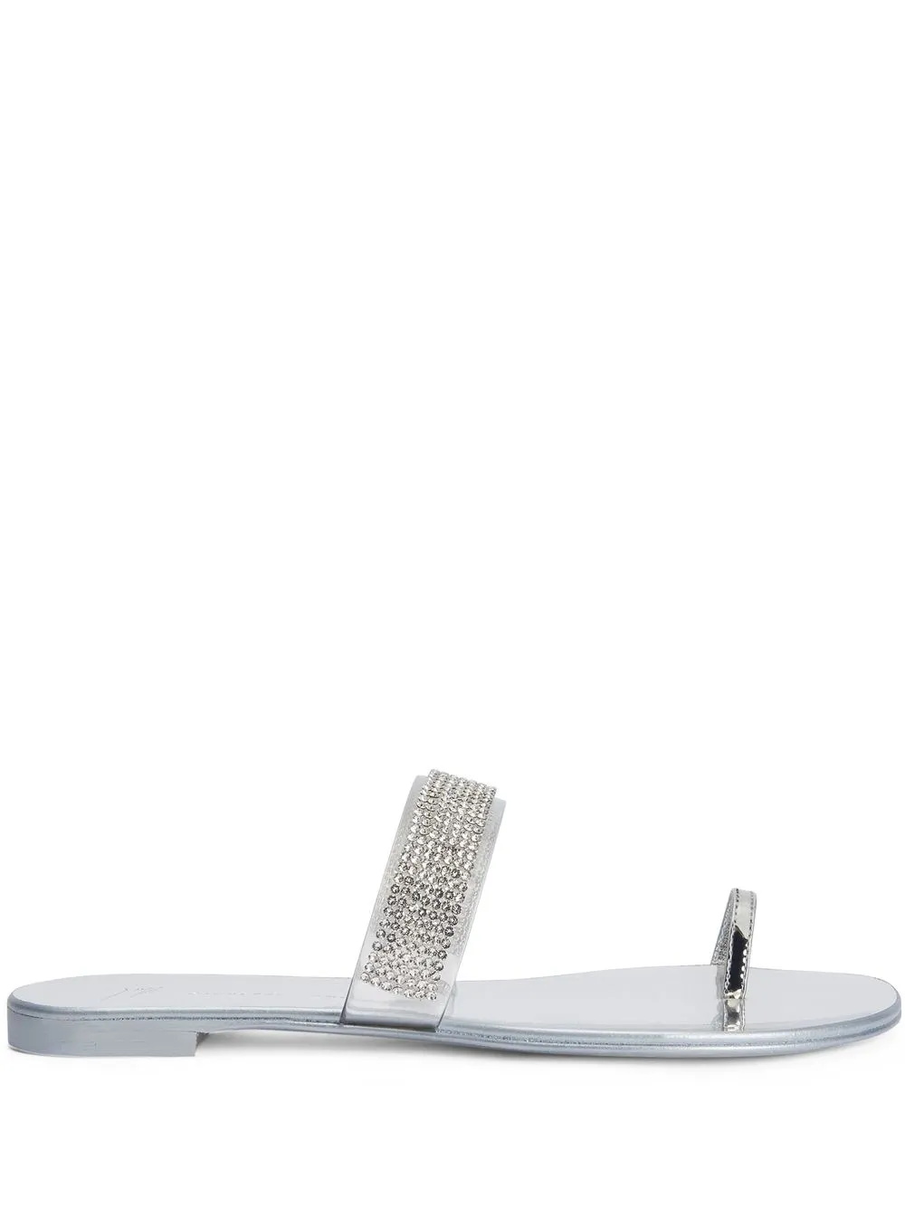 Erwan gem-detail flat sandals from Giuseppe Zanotti featuring silver, leather, gemstone detailing, transparent design, thin straps, round toe and branded insole.