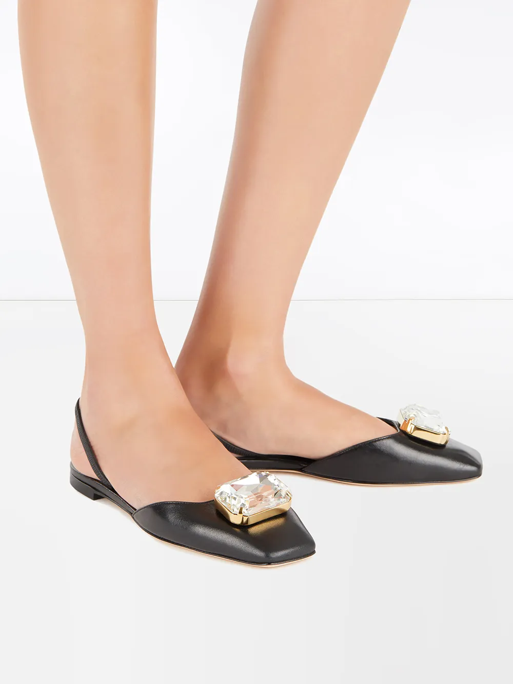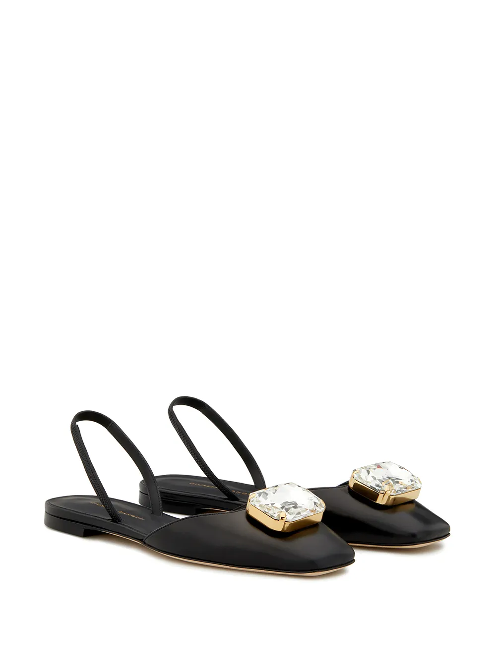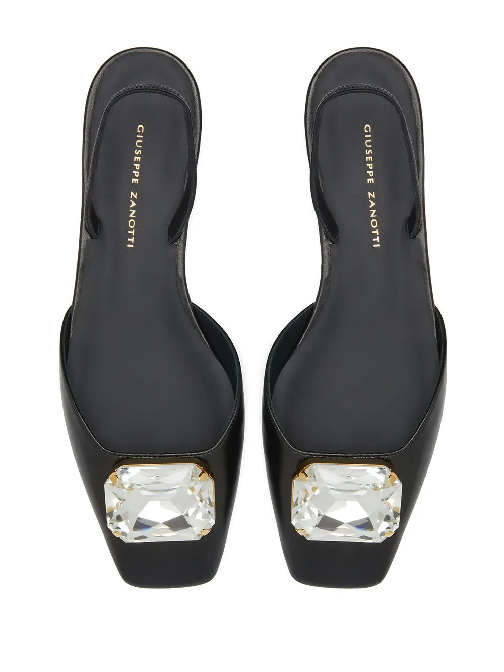 Black patent leather faceted crystal mules from Giuseppe Zanotti featuring a polished finish, a square toe, a branded insole, a slingback strap and a flat sole.