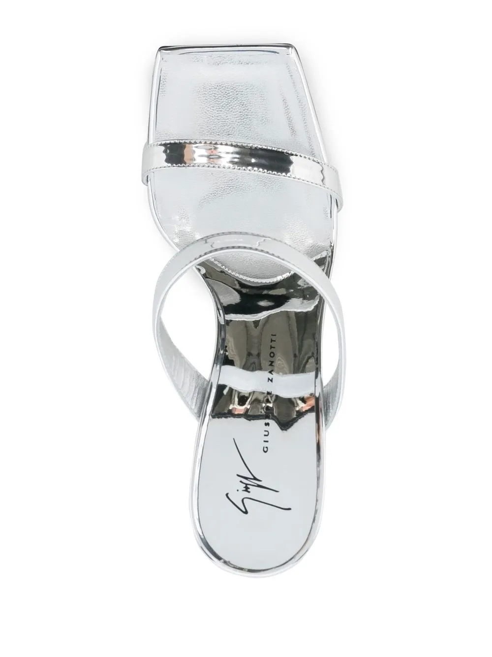Flaminia 90mm mules from Giuseppe Zanotti featuring silver-tone, calf leather, metallic finish, open toe, square toe and high sculpted heel.