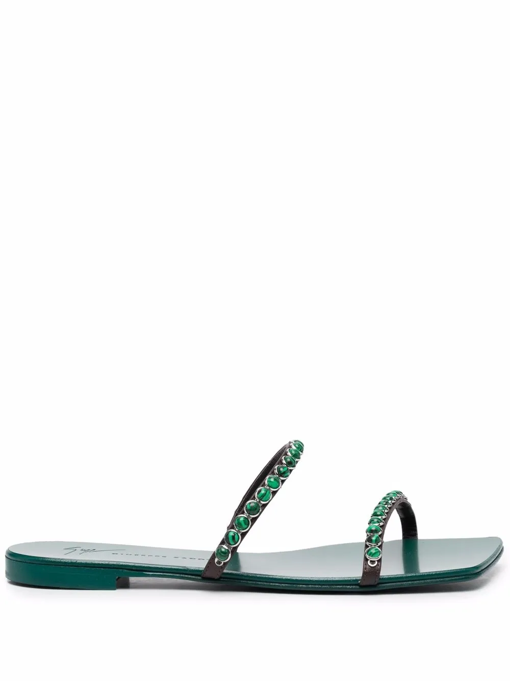 Forest-green leather gemstone-embellished open-toe sandals from Giuseppe Zanotti featuring gemstone detailing, open toe, square toe and low heel.