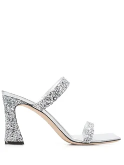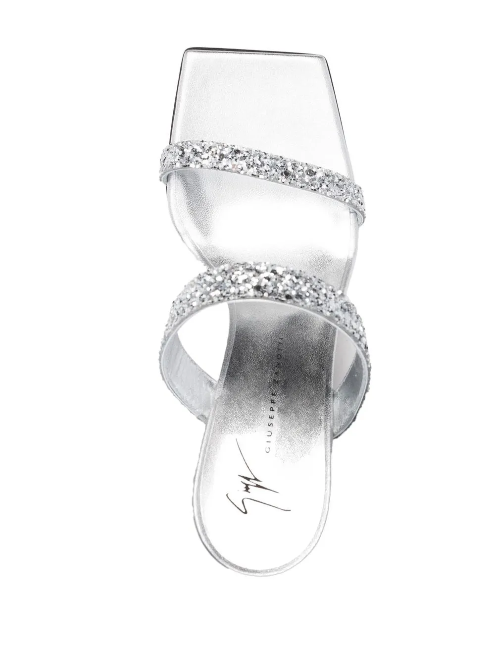 glitter-detail 95mm leather sandals from Giuseppe Zanotti featuring silver, leather, double-strap design, glitter detailing, square toe, open toe, branded leather insole and high sculpted heel.