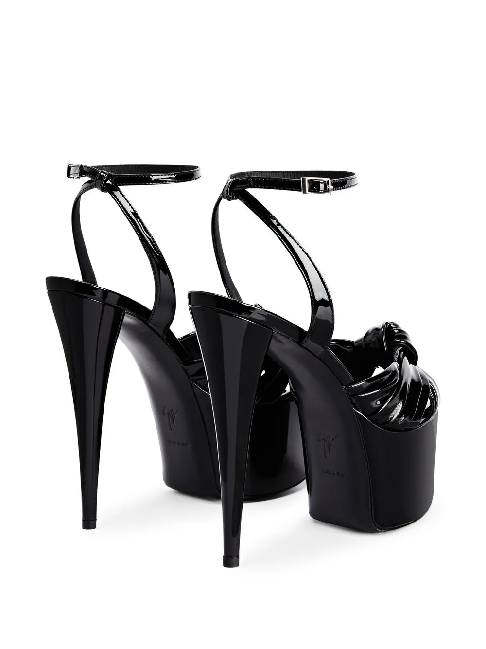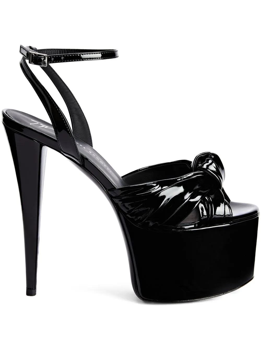 GZ Aida platform 150mm sandals from Giuseppe Zanotti featuring black, leather, knot detailing, patent finish, open toe, branded insole, buckle-fastening ankle strap, platform sole and 150mm heel.