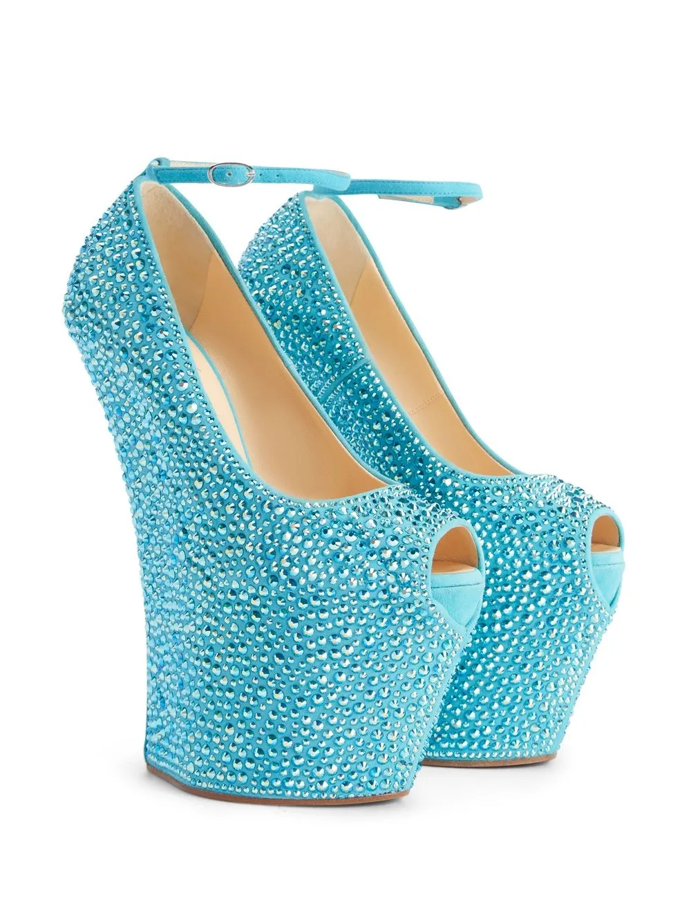GZ Mad 160mm pumps from Giuseppe Zanotti featuring aqua blue, leather, suede, crystal embellishment, peep toe, branded insole, platform sole, buckle-fastening ankle strap and 160mm wedge heel.