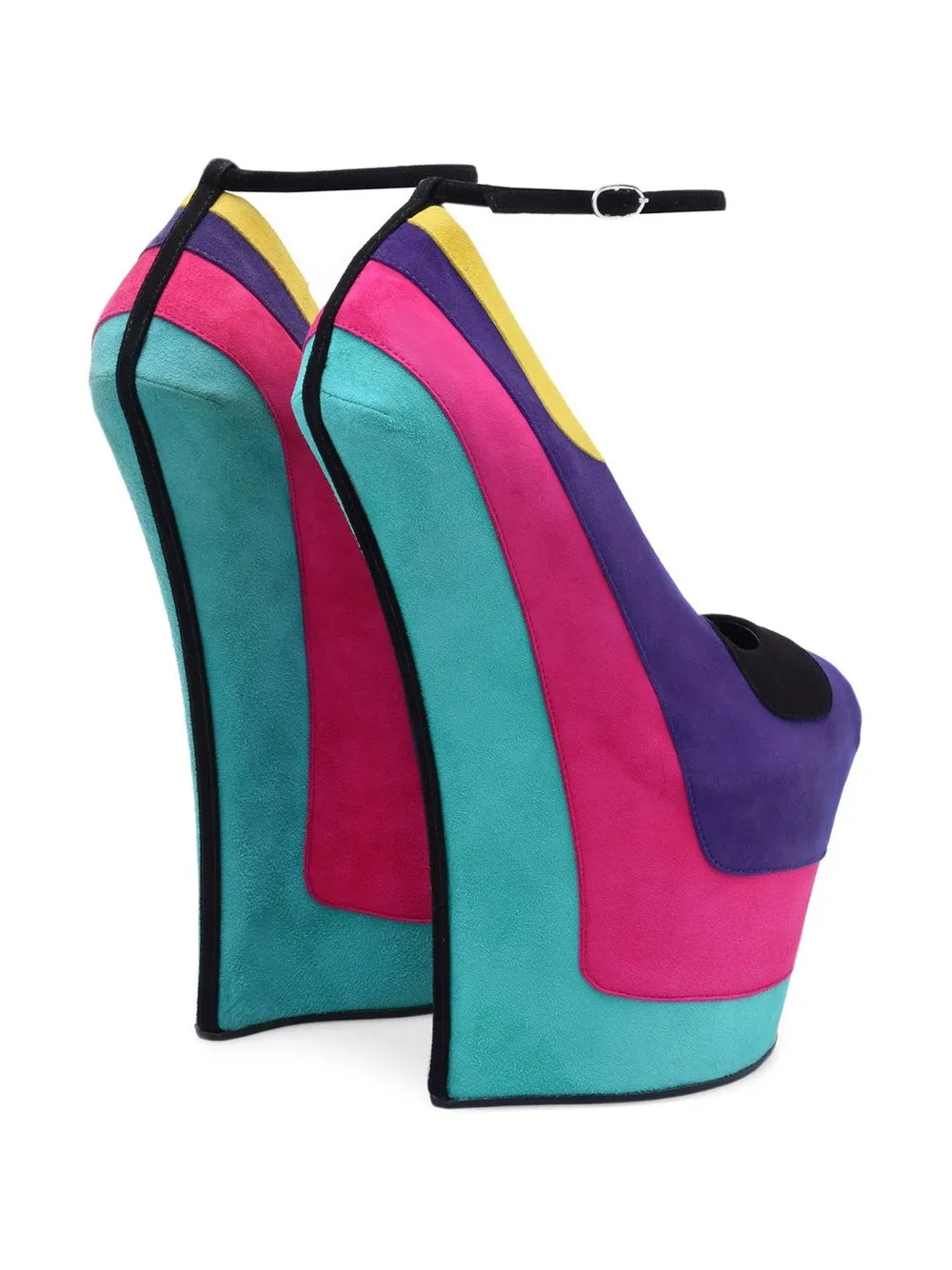 GZ Mad 160mm sculpted platform pumps from Giuseppe Zanotti featuring multicolour, suede, colour-block panelled design, branded leather insole, peep toe, buckle-fastening ankle strap, high sculpted heel and leather sole.