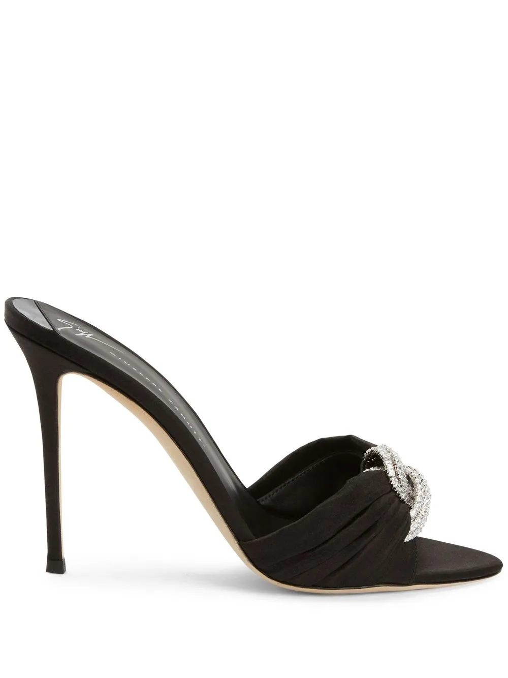 Intriigo Knot heeled mules from Giuseppe Zanotti featuring black, leather, satin trim, pleat detailing, crystal embellishment, branded insole, buckle detail at the toe, open toe, high stiletto heel and slip-on style.