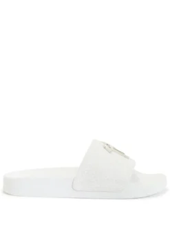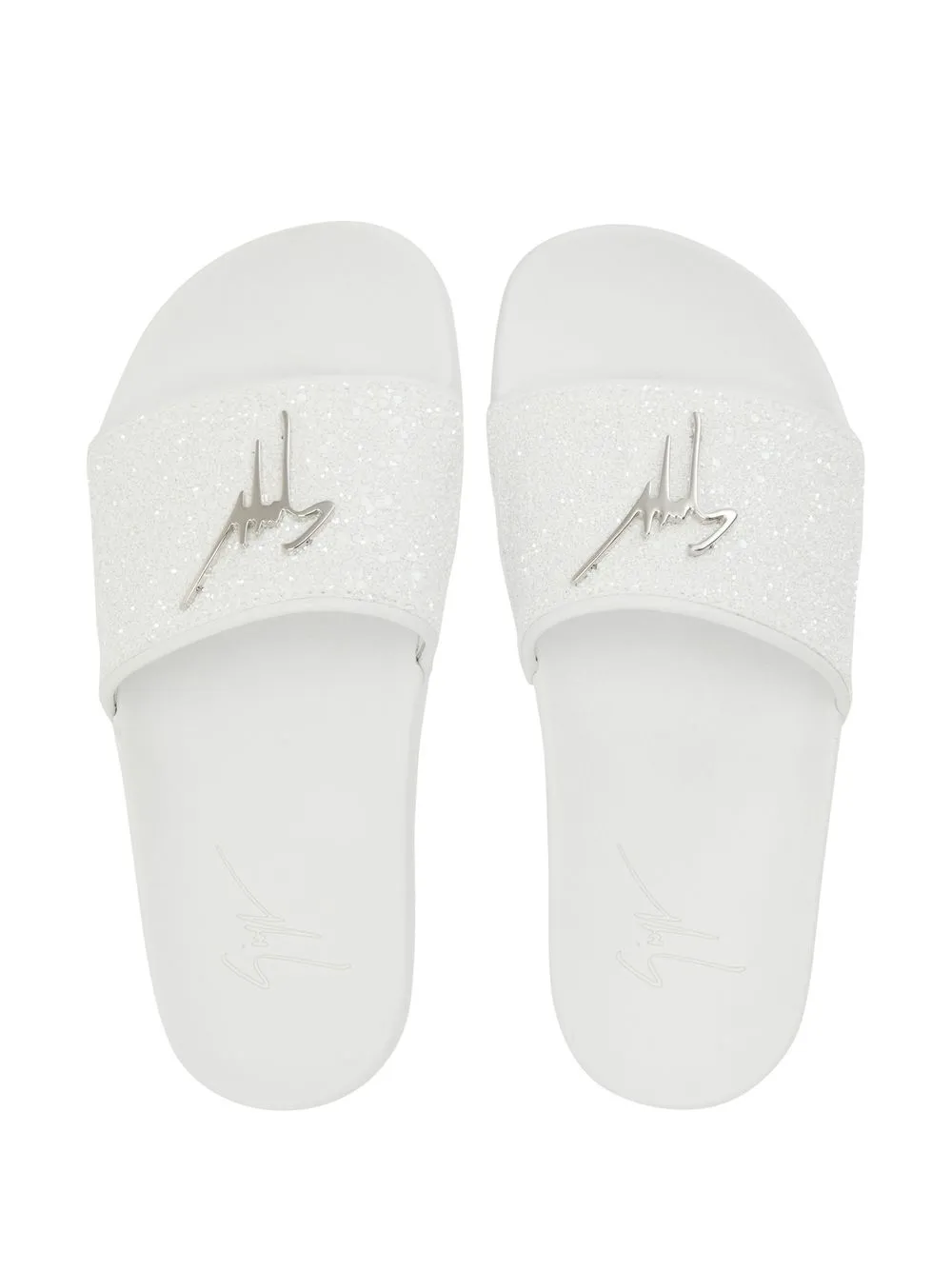 logo-plaque glitter sliders from Giuseppe Zanotti featuring white, cotton blend, silver-tone logo plaque, glitter detailing, moulded footbed, open toe and slip-on style.