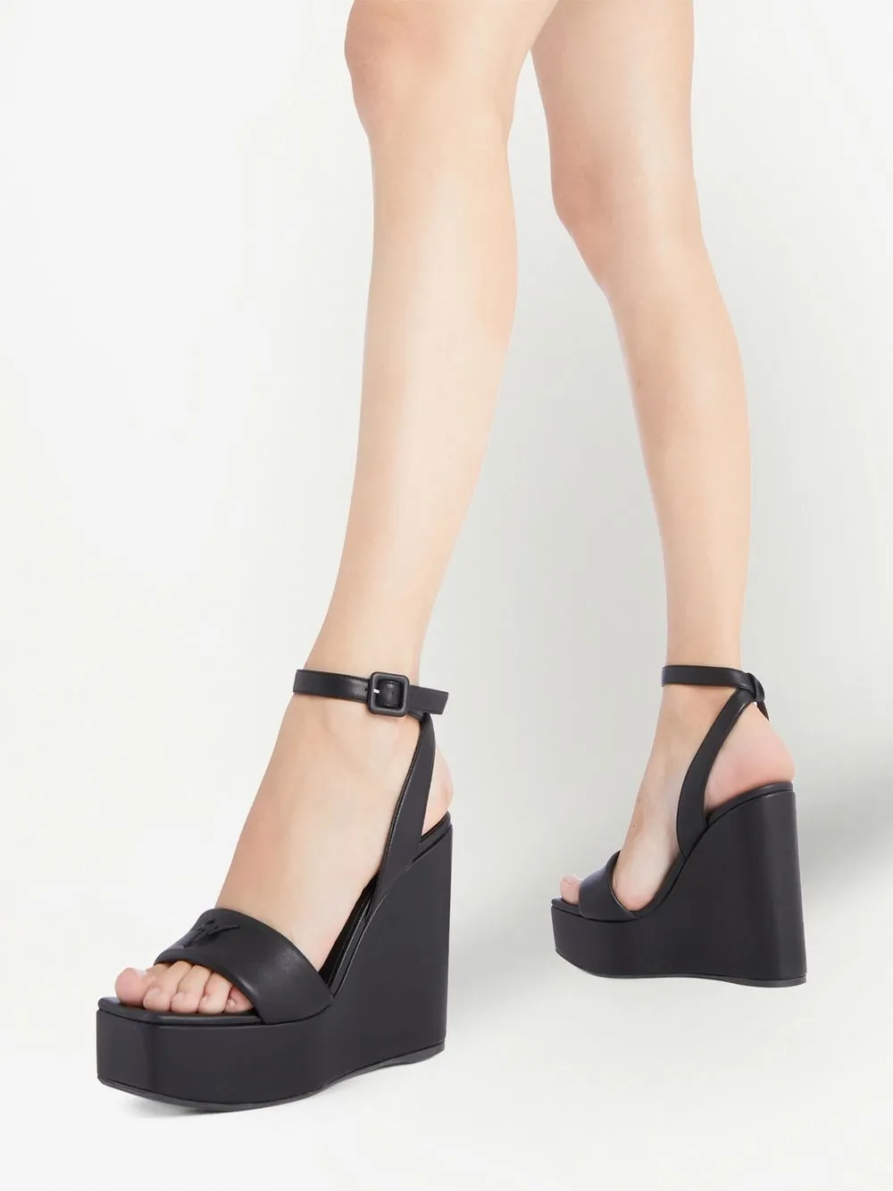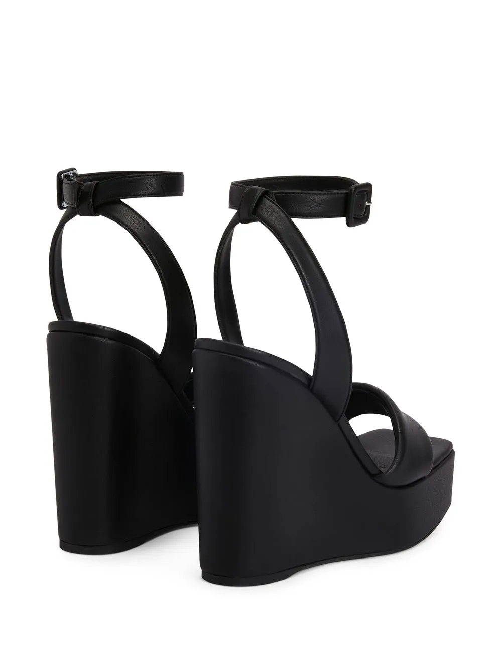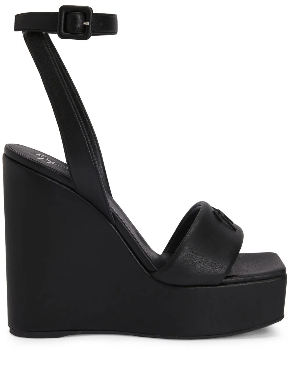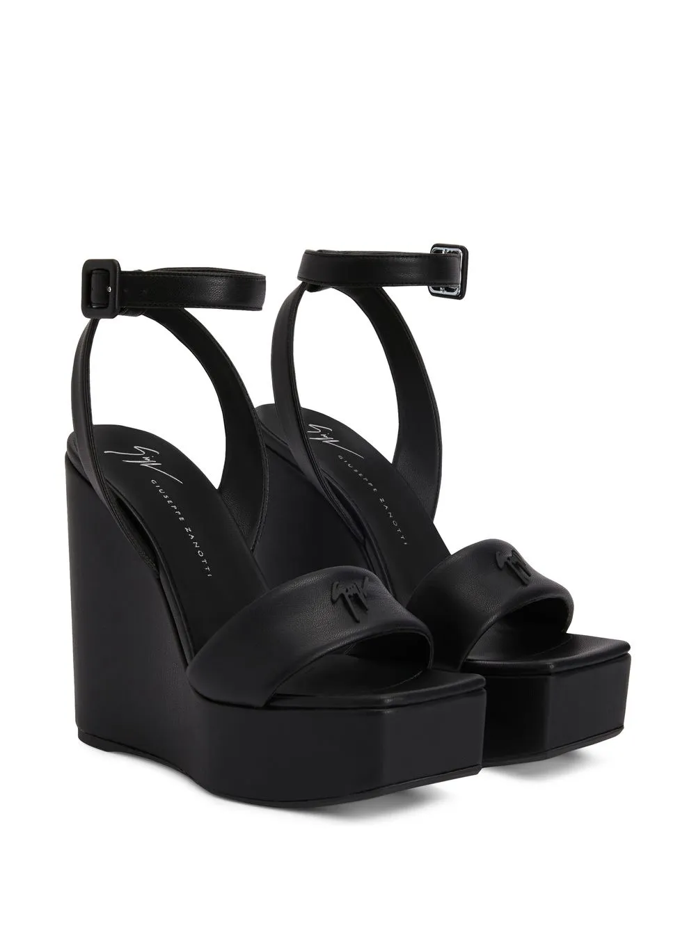Meissa 130mm platform sandals from Giuseppe Zanotti featuring black, leather, logo plaque, square toe, single toe strap, branded insole, buckle-fastening ankle strap, platform sole and 130mm wedge heel.
