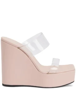 Meissa Plexi wedge sandals from Giuseppe Zanotti featuring light pink, leather, branded insole, transparent straps, square toe, open toe, high wedge heel, platform sole and slip-on style.